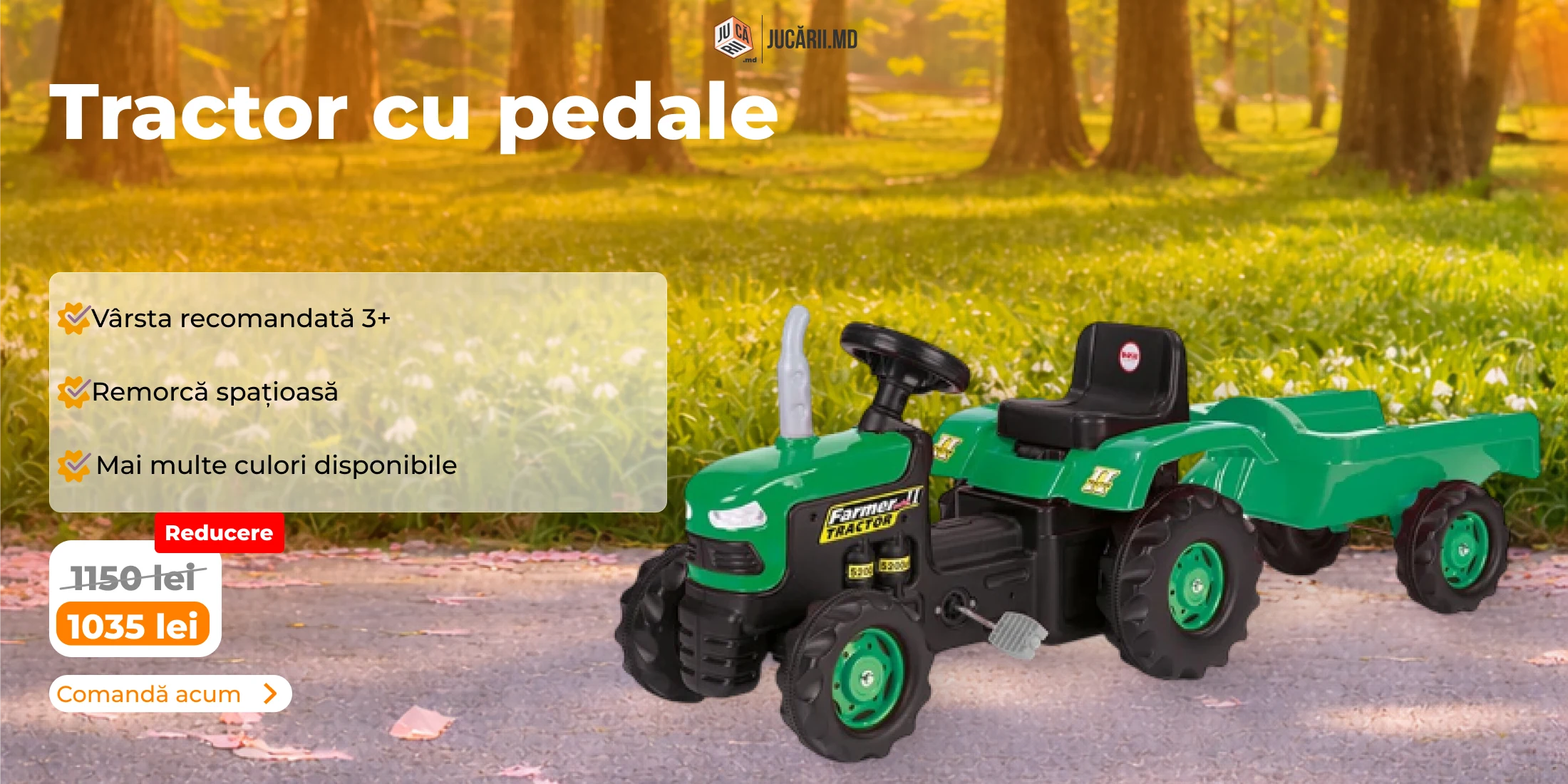- Mașinuțe & vehicule: mașinuțe cu telecomandă, piste de curse, camioane, tractoare, trenulețe electrice, avioane și elicoptere.