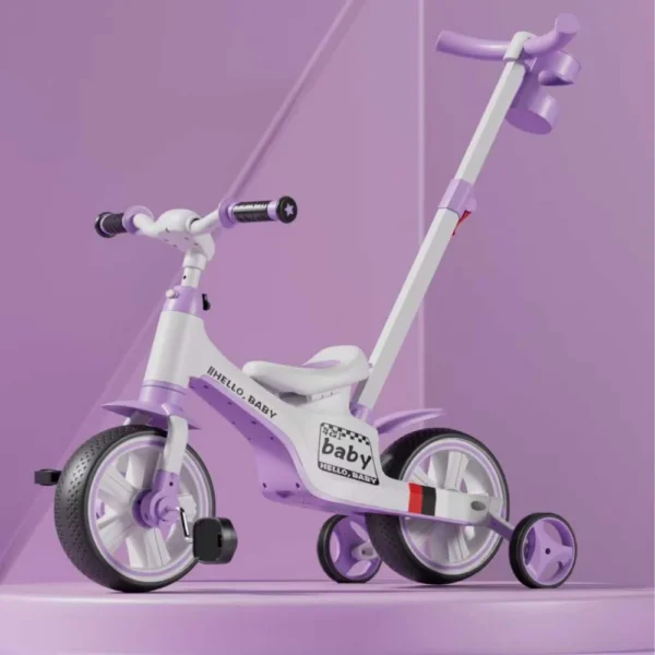 Tricicletă 4 în 1 pentru copii, cu mâner parental, muzică și lumini, mov (402867)