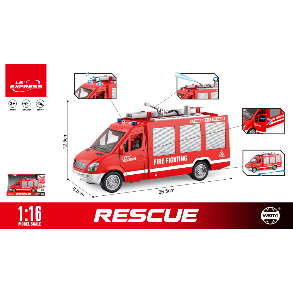 Fii pregătit pentru orice intervenție cu autospeciala de pompieri WY595A, jucăria perfectă pentru micii eroi pasionați de acțiune și salvare! Dotată cu efecte de lumină și sunet, mecanism cu inerție și o pompă de apă funcțională, această autospecială aduce realism și distracție în fiecare joc.