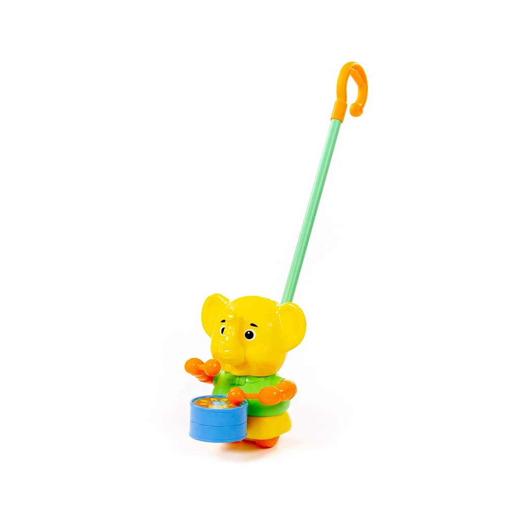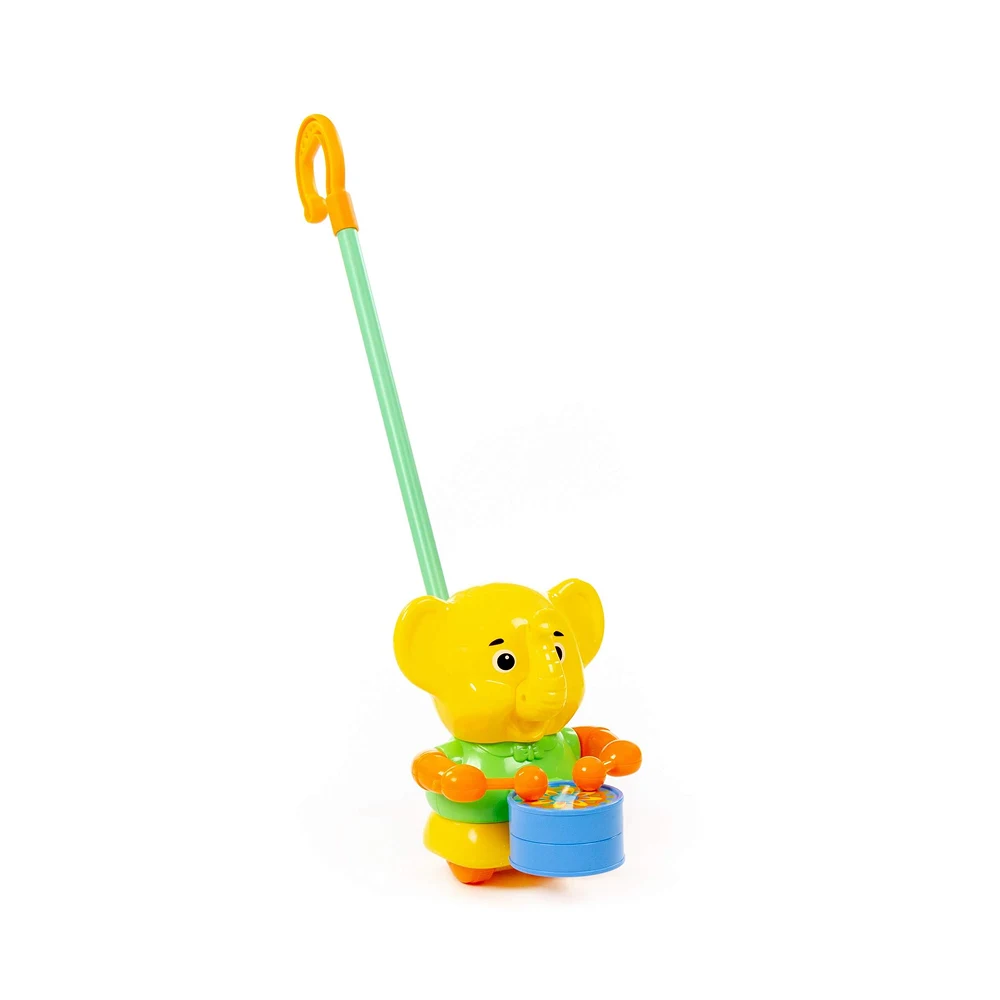 Jucărie de împins în formă de elefant, cu mâner lung, ideală pentru joaca activă a copiilor mici. Stimulează mersul, coordonarea și dezvoltarea motrică într-un mod distractiv.