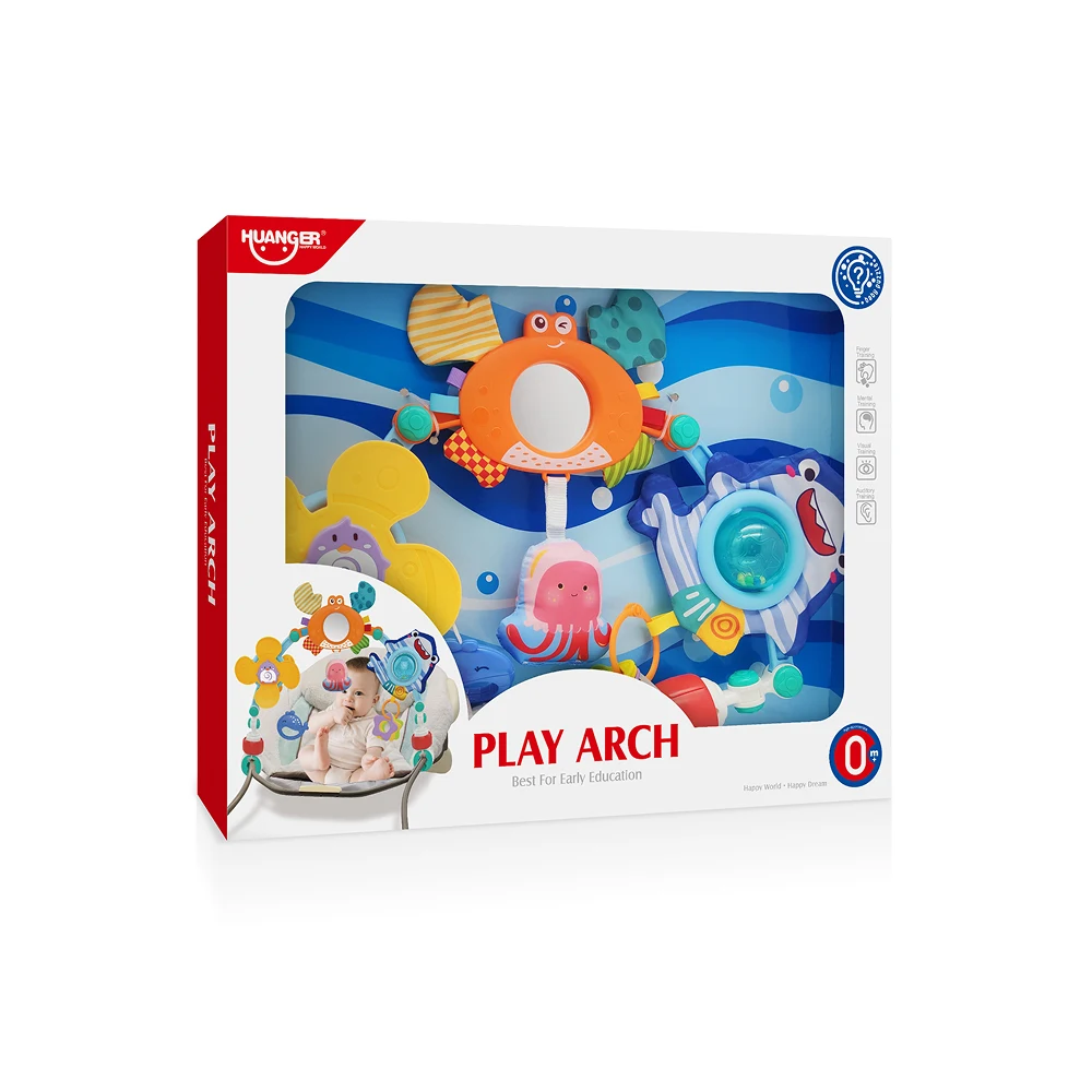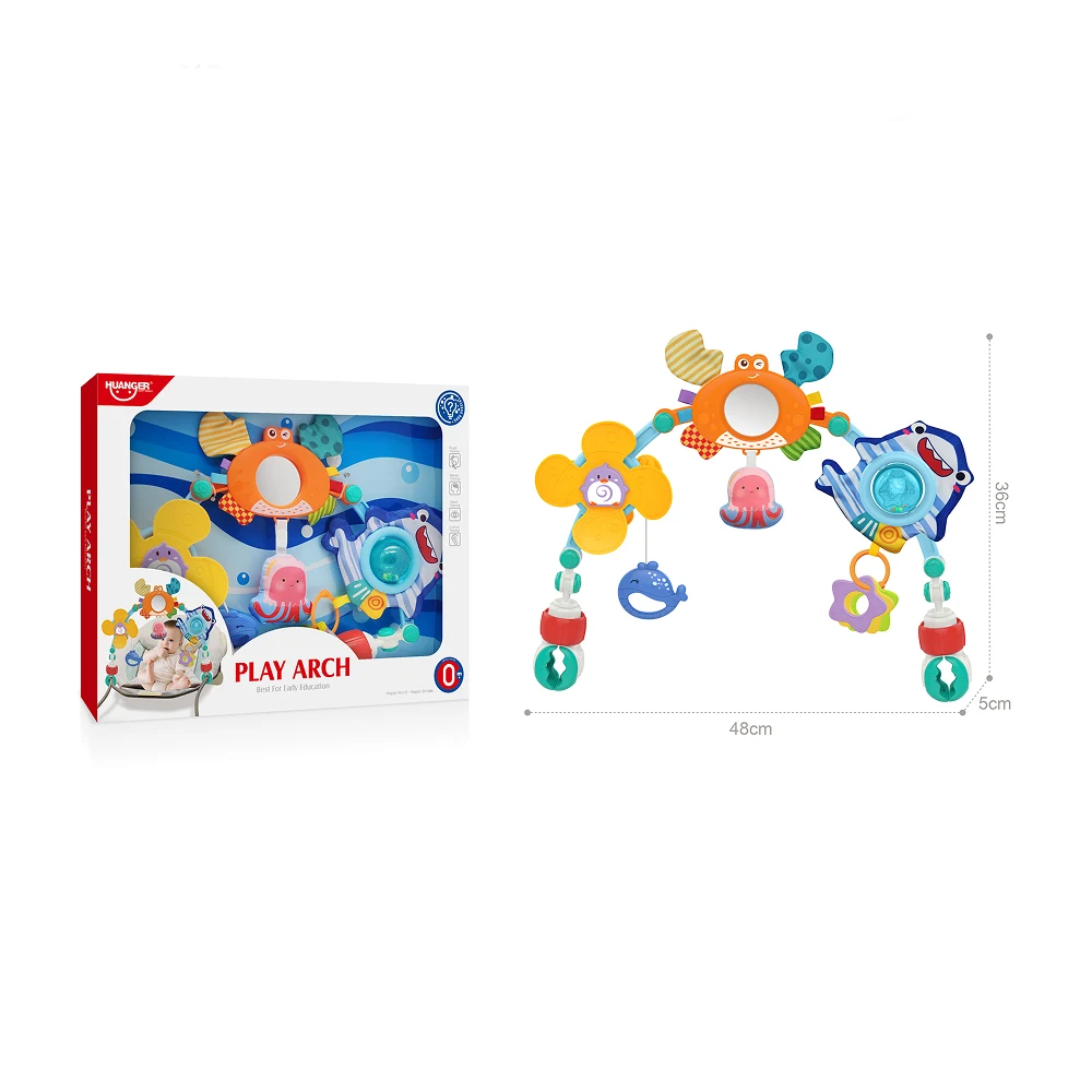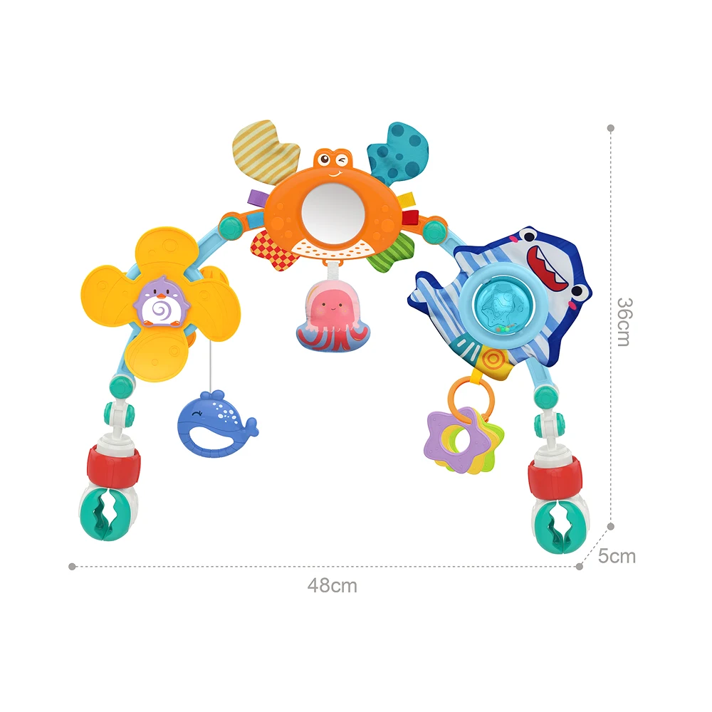Arcul de joacă cu jucării suspendate, tematică marină, este o jucărie de activități ideală pentru dezvoltarea timpurie a bebelușilor. Designul în formă de arc permite prinderea ușoară pe pătuț, scoică sau scaun auto, oferind copilului acces direct la jucării colorate și variate.