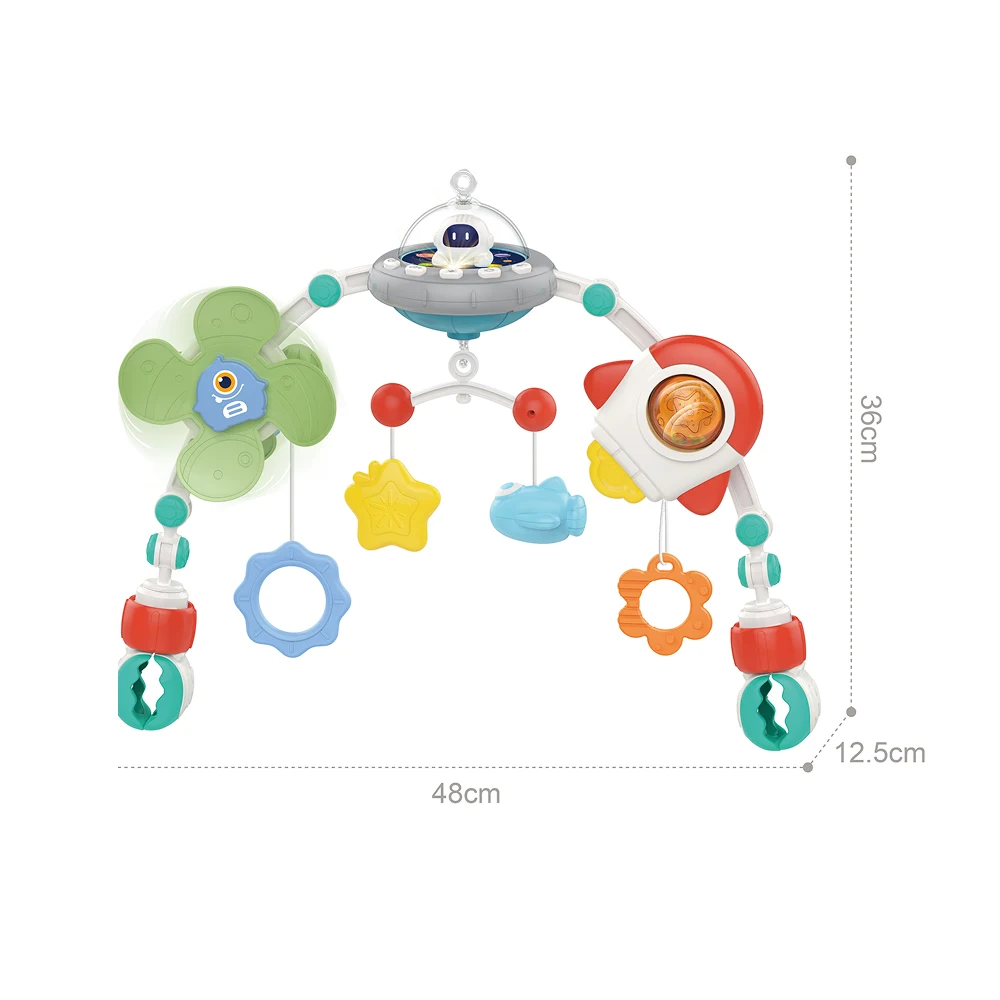 Arc de joacă suspendat pentru cărucior, scoică auto și pătuț, ideal pentru stimularea dezvoltării senzoriale și motorii a bebelușilor. Jucăriile suspendate, în culori vii și forme atractive, captează atenția copilului și îl încurajează să atingă, să apuce și să exploreze.