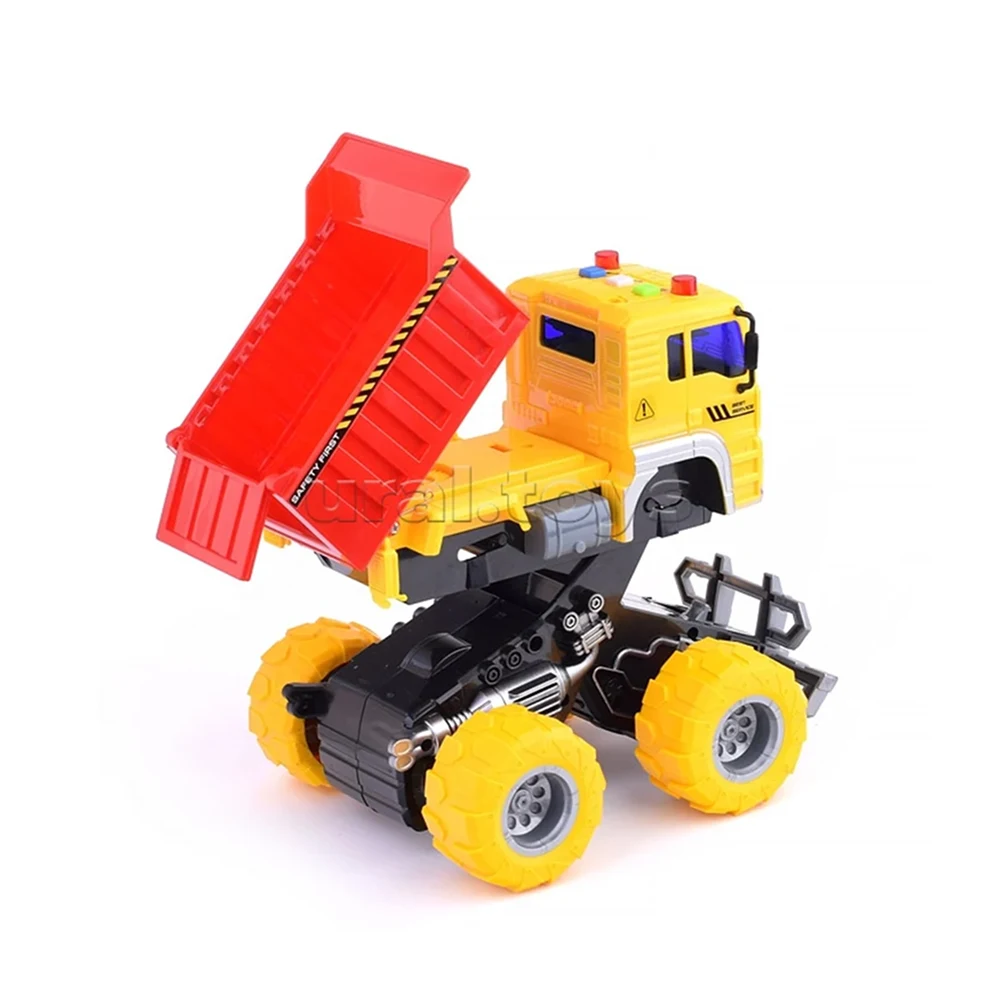 Autospecială basculantă off-road cu mecanism pe inerție, lumini și sunete, ideală pentru copiii de la 3+ ani și perfectă pentru jocuri de construcție și transport.