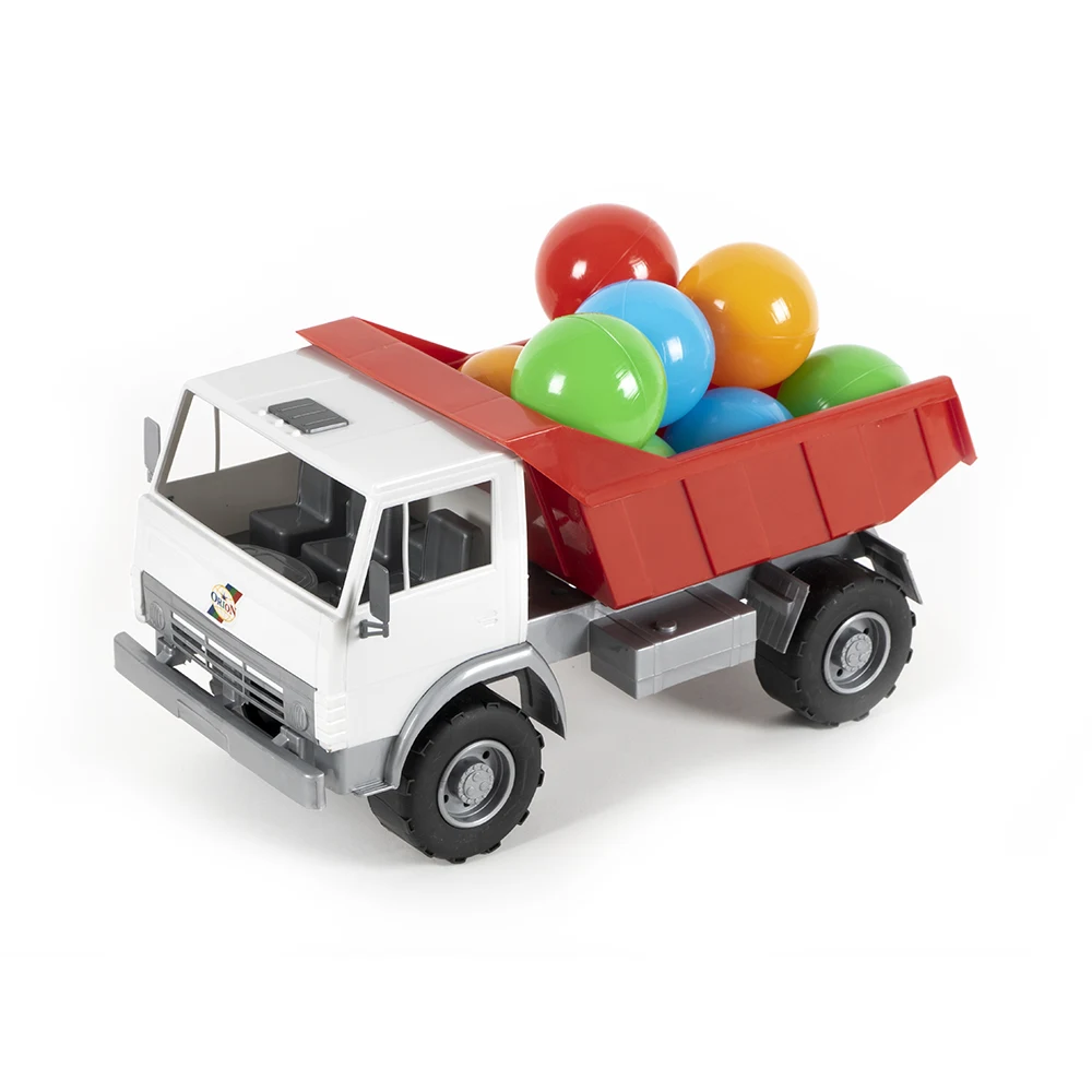Autospeciala Camaz cu bile colorate este o jucărie perfectă pentru copiii de 3+ ani, combinând transportul cu joaca interactivă. Dimensiuni: 385 × 195 × 200 mm.