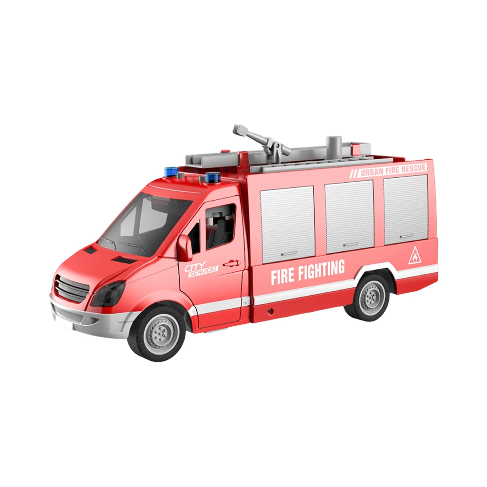 Autospecială de pompieri realistă, cu sistem de inerție, lumini, sunete și furtun funcțional cu apă, ideală pentru jocuri de salvare pline de acțiune.