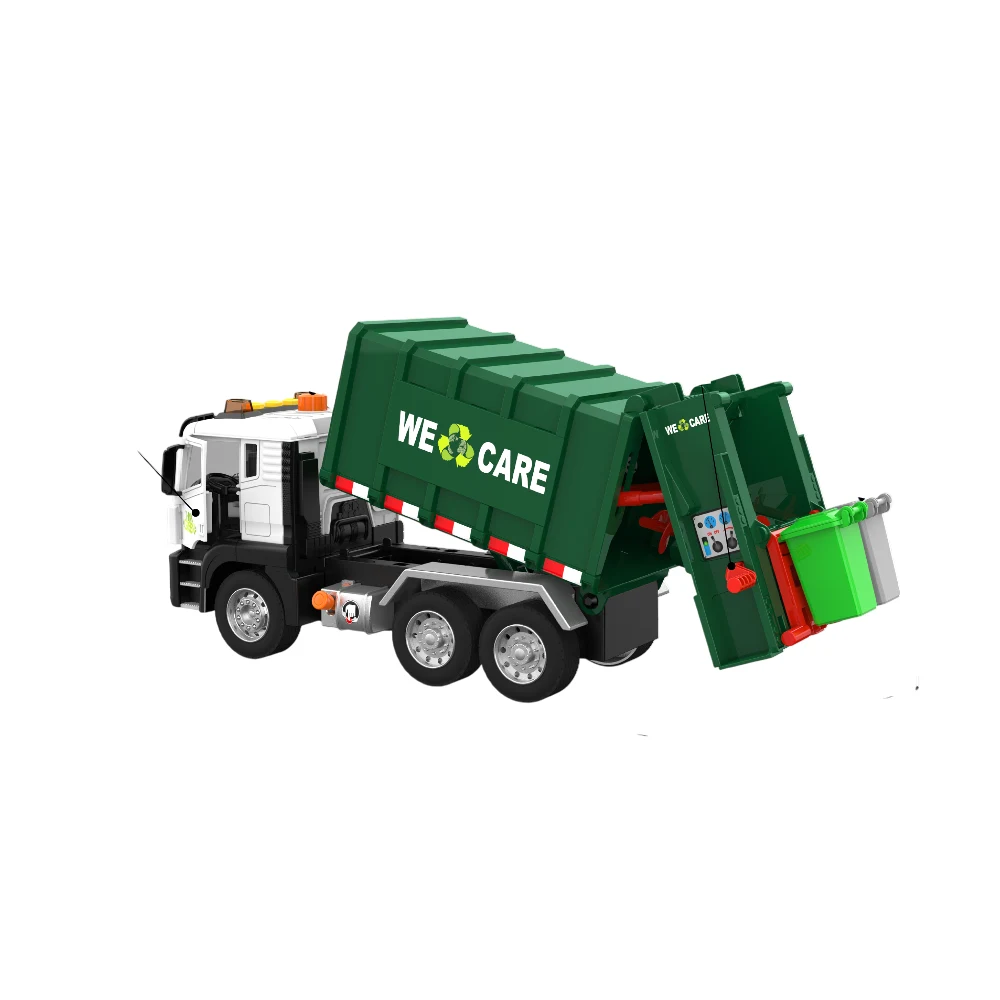 Autospecială de salubritate pentru copii, de mari dimensiuni, cu mecanism cu inerție, lumini și sunete, ideală pentru jocuri educative și de rol legate de reciclare și protecția mediului.