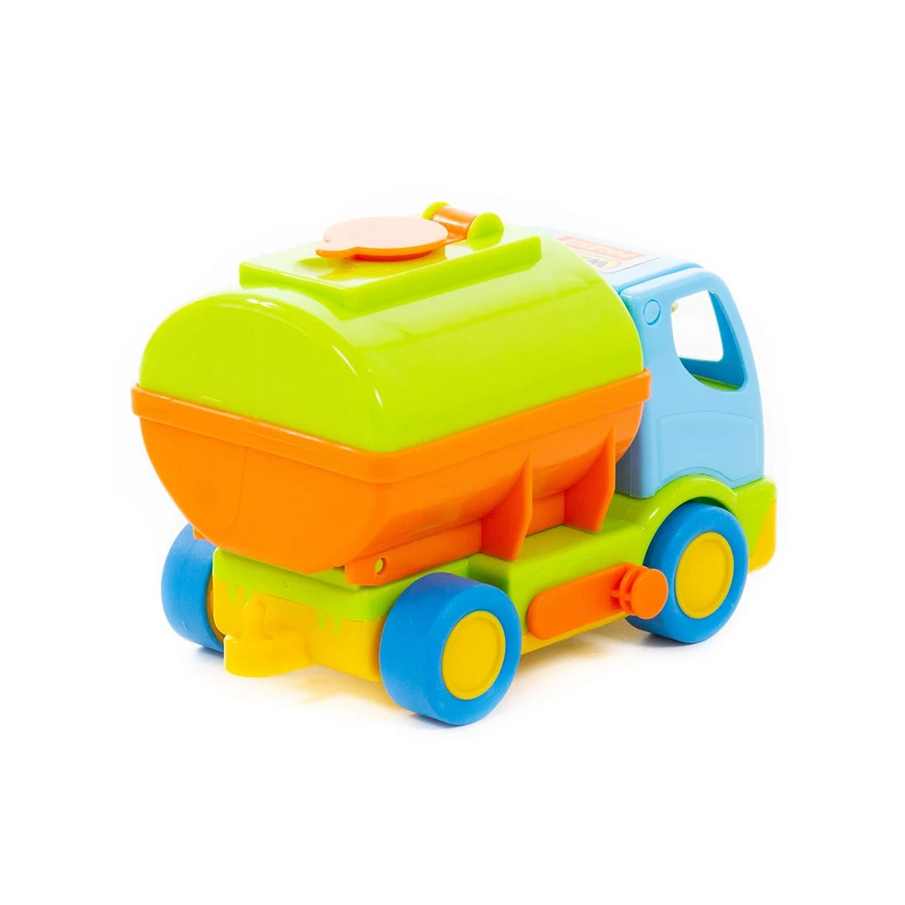 Camion-cisternă colorat, special conceput pentru cei mai mici copii, ideal pentru primele jocuri cu vehicule și dezvoltarea motricității.