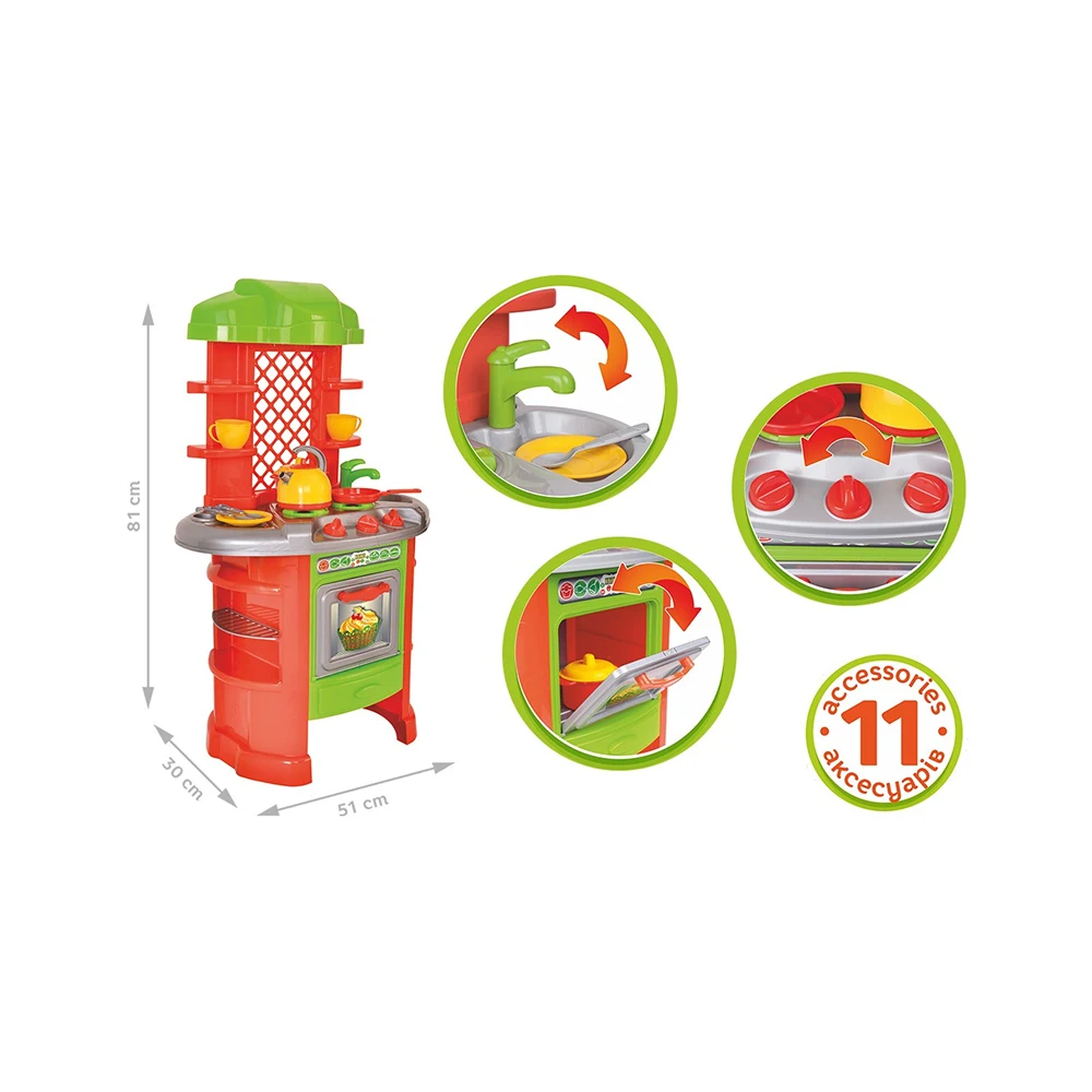 Realizată din materiale sigure, non-toxice, cu culori vii și forme adaptate vârstei, această bucătărie este ideală pentru jocuri educative și distractive de lungă durată.