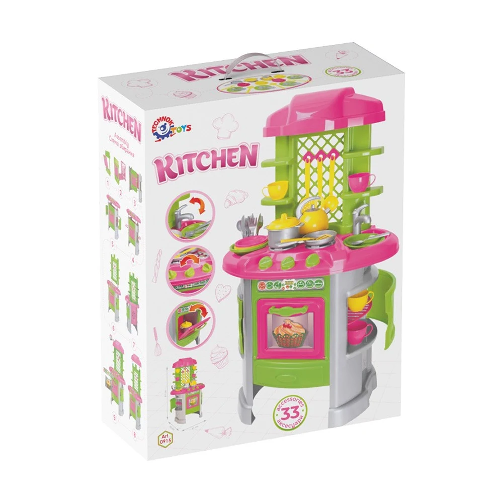 Bucătărie de jucărie cu accesorii incluse, ideală pentru jocuri de rol creative și dezvoltarea imaginației copiilor de la 3 ani.