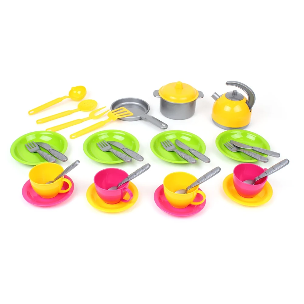 Setul include accesorii de bucătărie adaptate mâinilor copiilor, care încurajează joaca activă și creativă. Culorile vii și elementele decorative atrag atenția și mențin interesul pe termen lung. Bucătăria este potrivită pentru joacă individuală sau în grup, contribuind la dezvoltarea abilităților sociale și a coordonării mână–ochi.