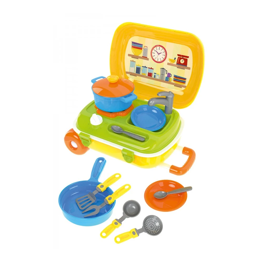 La deschidere, valiza se transformă într-o mini-bucătărie de joacă, dotată cu aragaz, chiuvetă și accesorii de gătit. Copiii pot inventa diverse scenarii culinare, dezvoltându-și imaginația, creativitatea și abilitățile sociale.