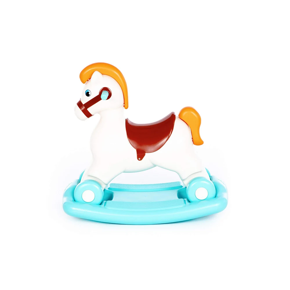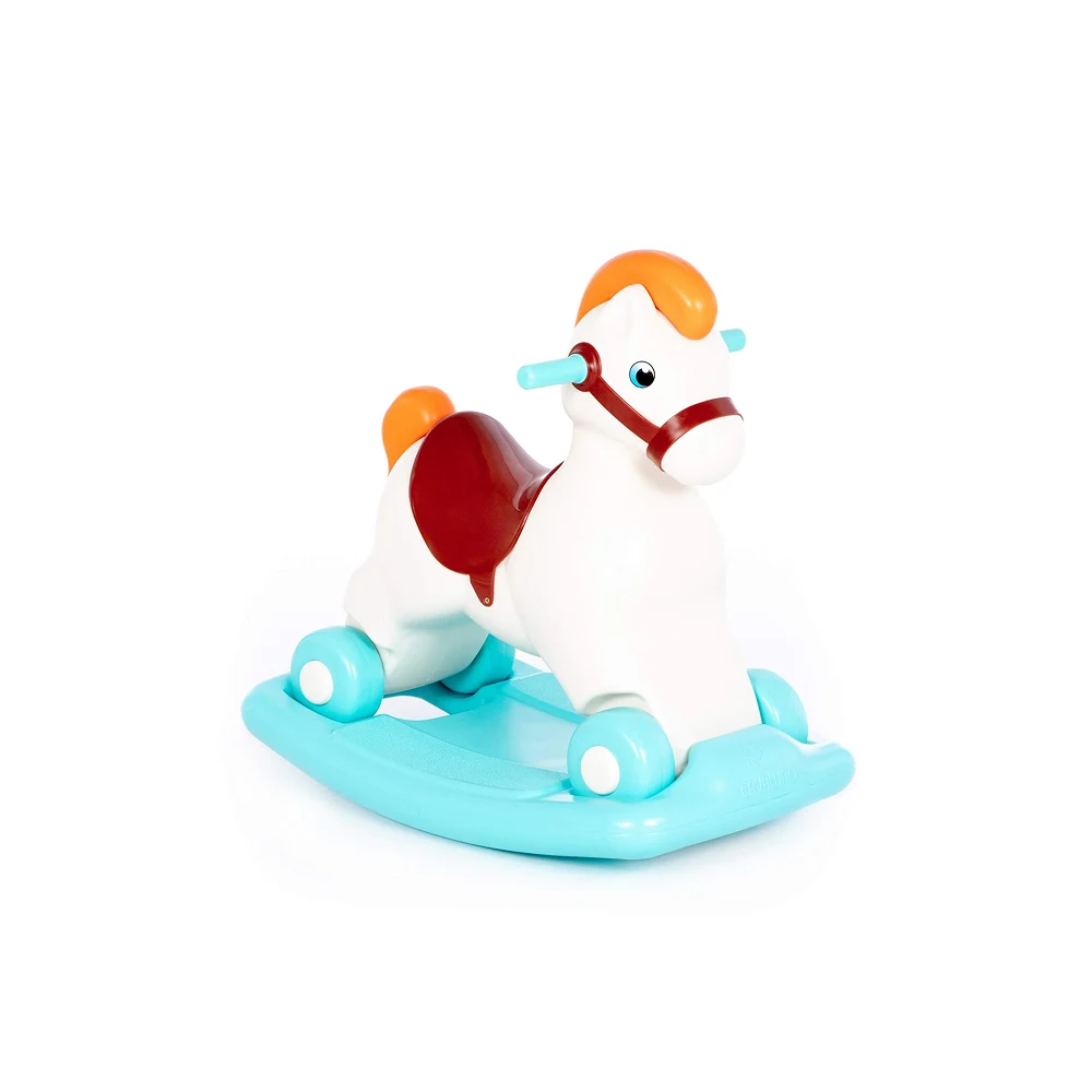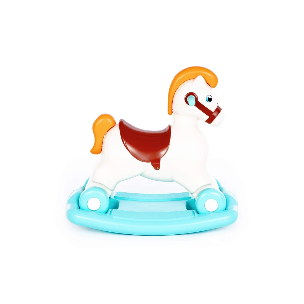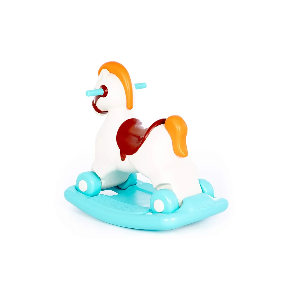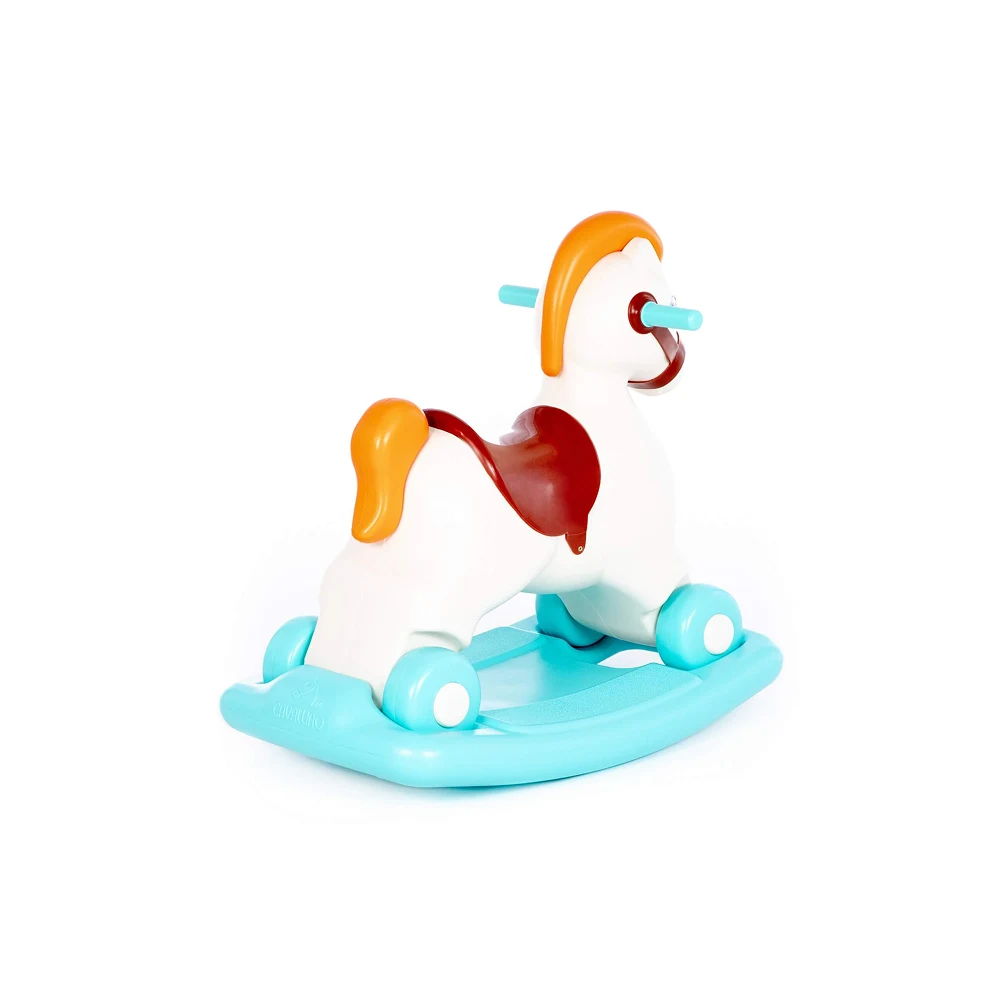 Căluț leagăn cu roți, stabil și sigur, ideal pentru distracția și dezvoltarea motrică a copiilor mici.