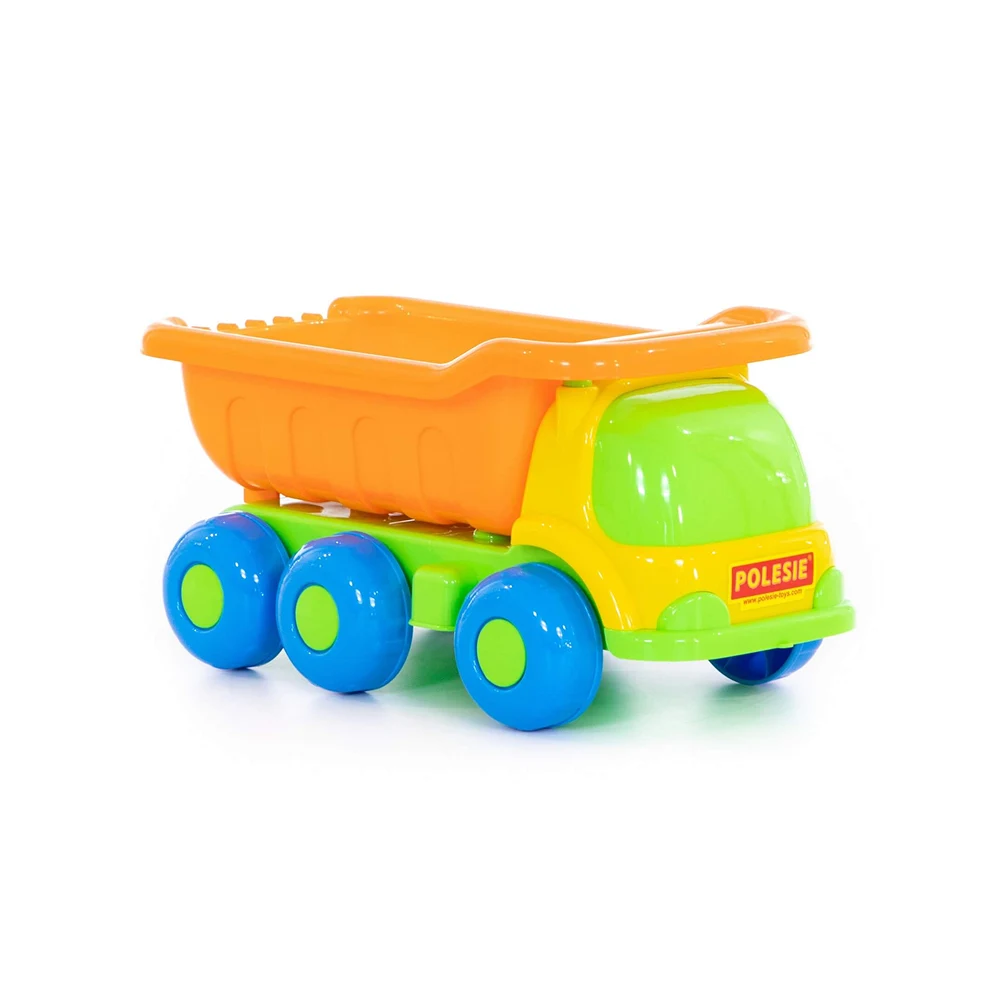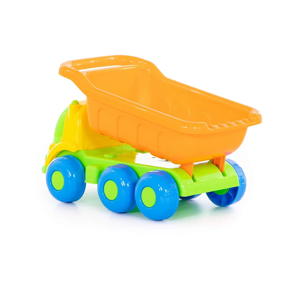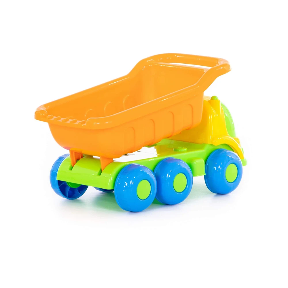 Camion basculant de jucărie pentru copii, ideal pentru joaca în nisip și jocuri de construcții, cu benă basculabilă și design colorat.