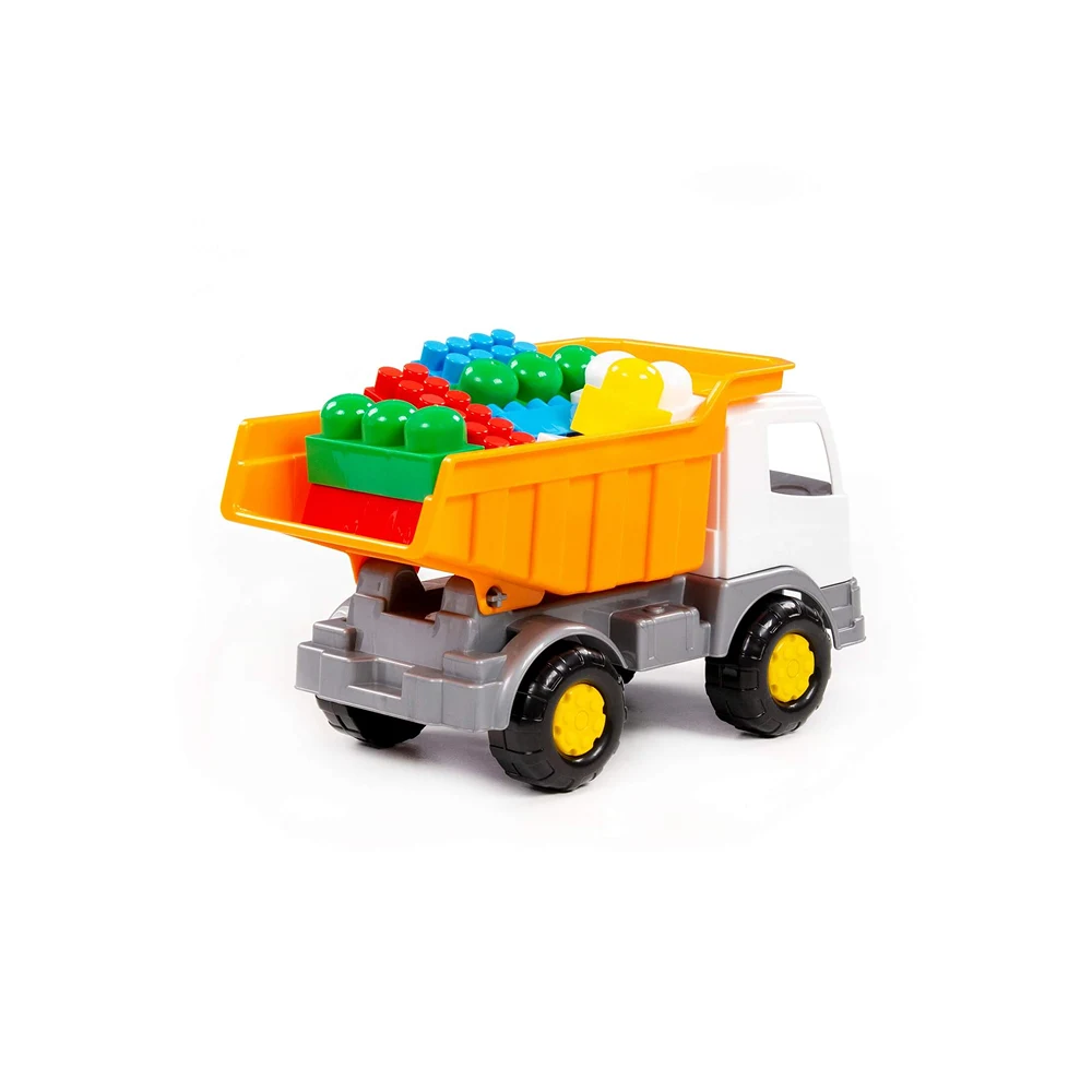 Camion basculant colorat cu set de construcție inclus, ideal pentru jocuri de transport și construcții, stimulând creativitatea și îndemânarea copiilor.