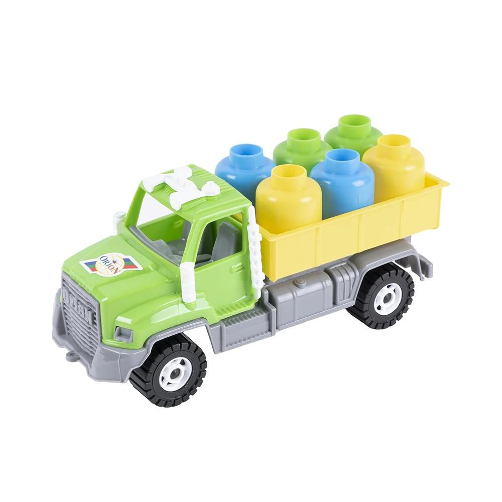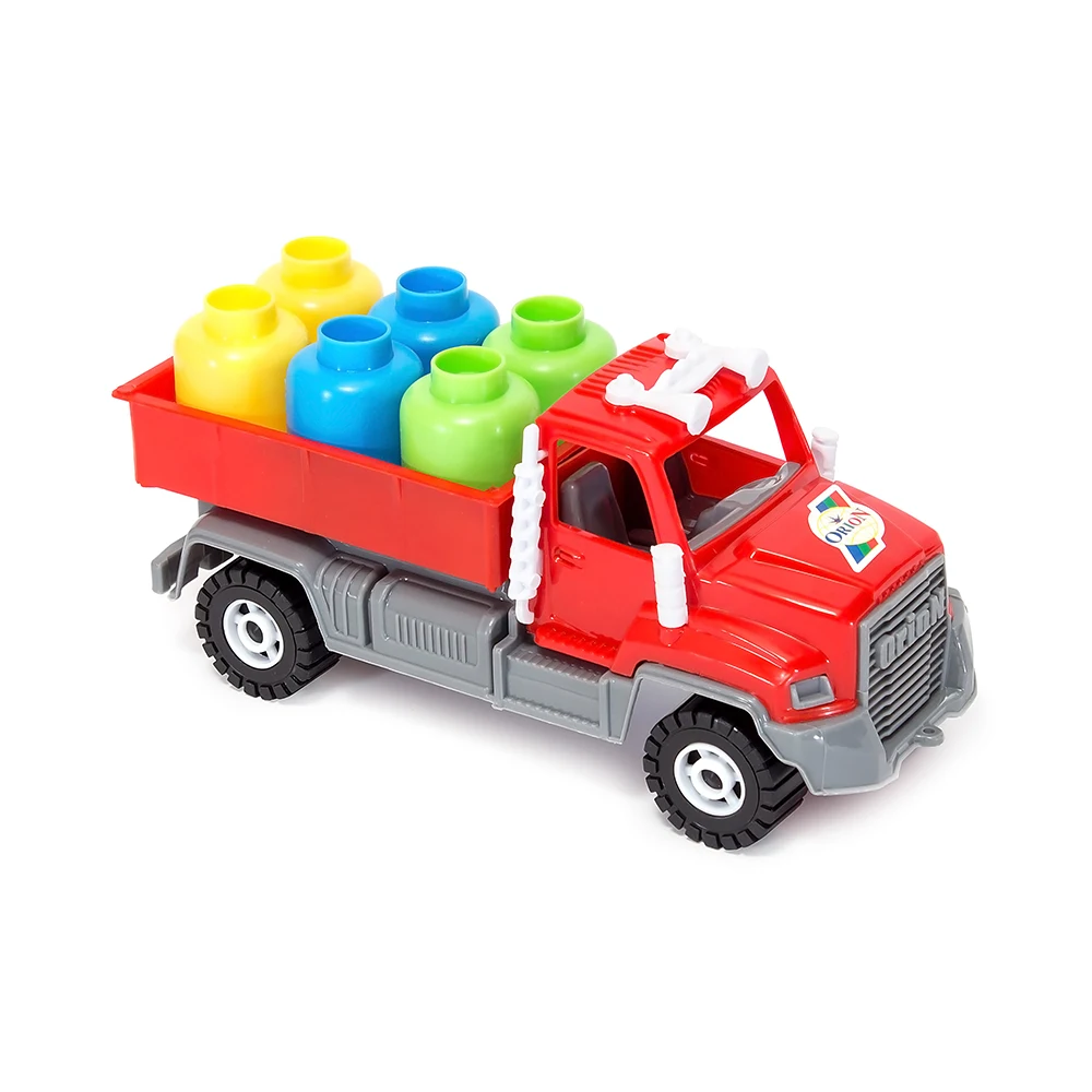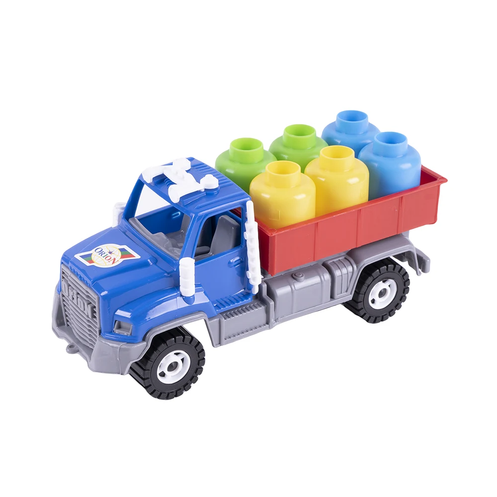 Camion din plastic rezistent, recomandat copiilor de 3+ ani, cu 6 butoaie colorate incluse. Dimensiuni: 220 × 90 × 120 mm. Ideal pentru joacă creativă și dezvoltarea imaginației.
