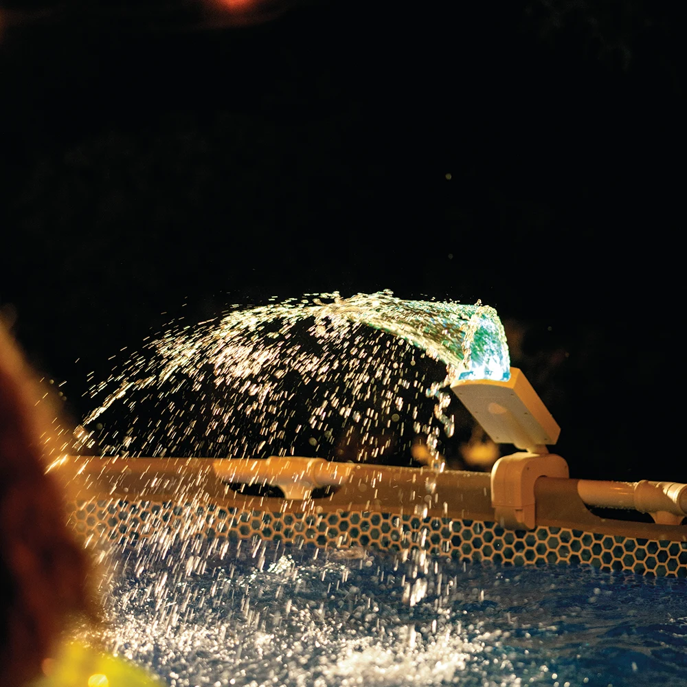 Cascadă iluminată cu LED-uri, concepută pentru a crea un efect vizual plăcut și pentru a răcori apa în timpul funcționării piscinei. Se conectează direct la sistemul de filtrare, fără baterii sau alimentare electrică.
