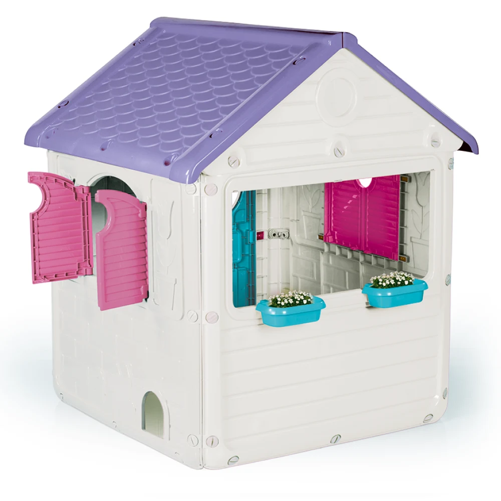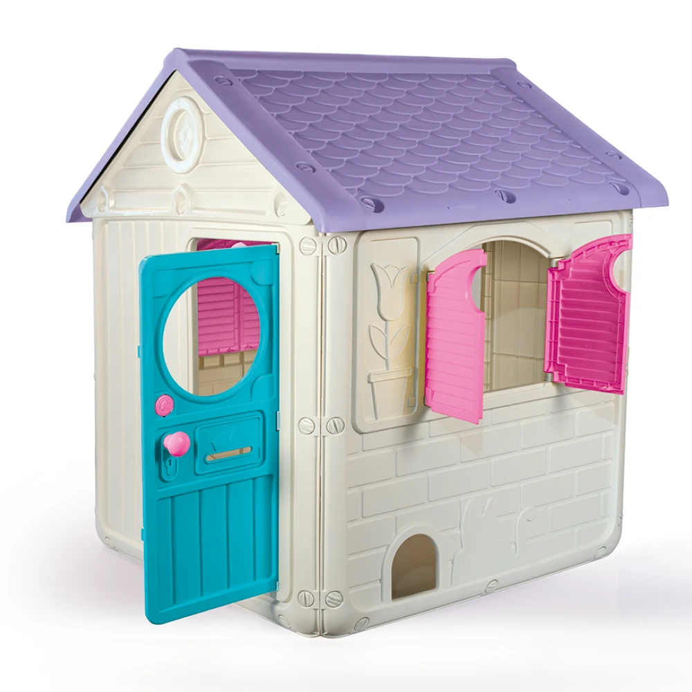 Modelul este prevăzut cu ușă funcțională, ferestre cu obloane, sonerie electronică și cutie poștală, detalii care fac jocul de rol mai realist și mai distractiv. În plus, căsuța include ușiță pentru animale și suporturi pentru ghivece, pentru un aspect mai jucăuș și mai interactiv.