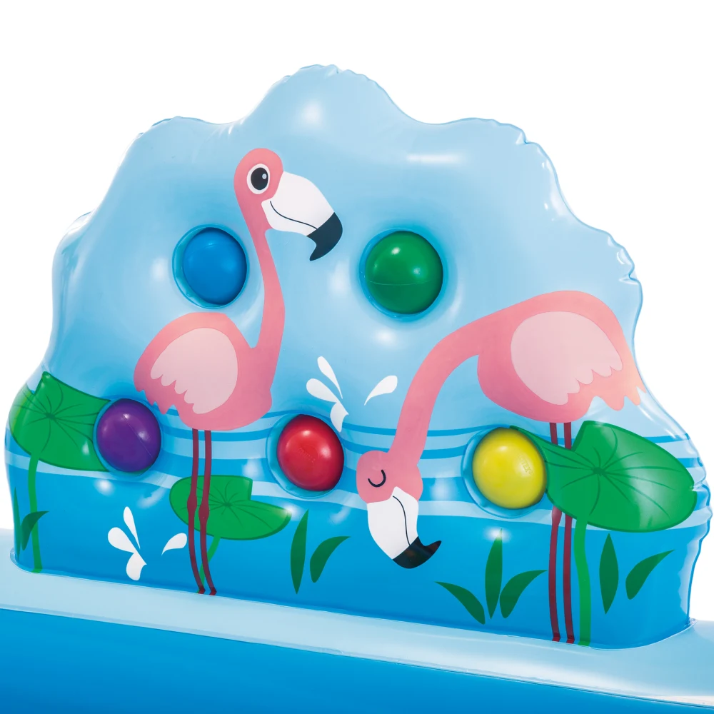 Jocurile interactive includ figurine gonflabile tematice, cerc pentru aruncare și mingi colorate, stimulând joaca activă, coordonarea și interacțiunea. Sistemul de pulverizare cu apă se conectează ușor la furtunul de grădină, adăugând un plus de răcorire și distracție în zilele călduroase.