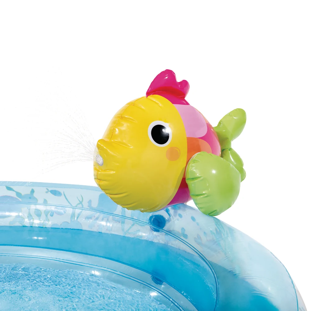 Centrul este prevăzut cu pulverizator de apă, care poate fi conectat la furtunul de grădină, asigurând un plus de răcorire și distracție în timpul jocului. Include elemente gonflabile tematice și detalii vizuale subacvatice care creează un ambient vesel și dinamic.