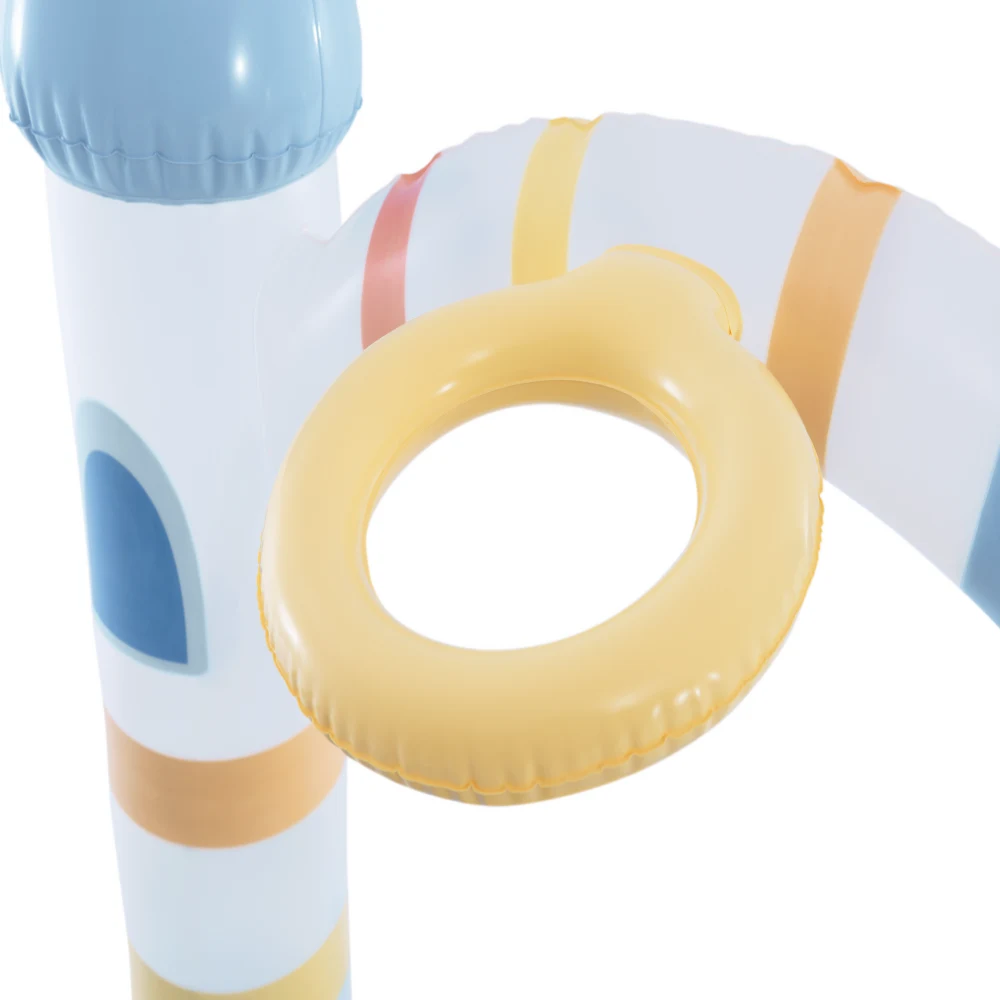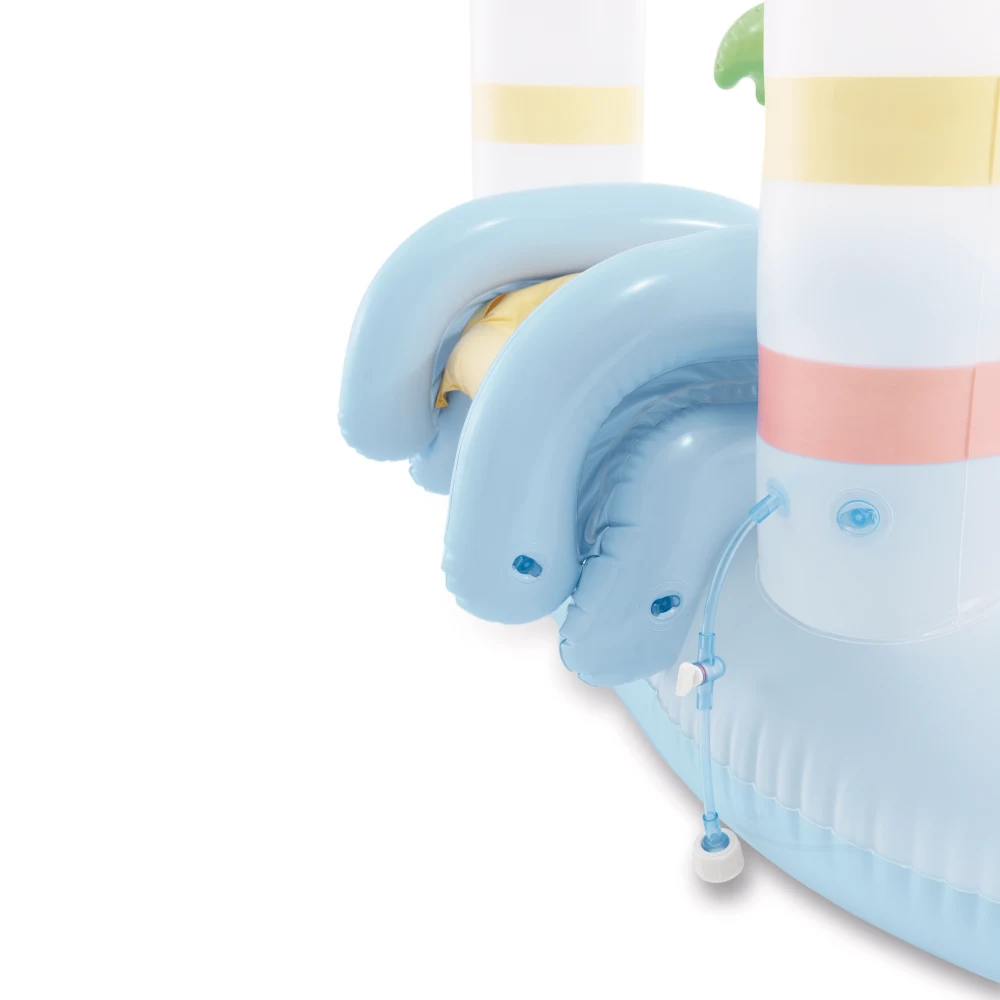 Zona centrală cu apă este completată de un tobogan gonflabil cu zonă de aterizare, care oferă o alunecare confortabilă și sigură. Structura include un arc tip castel, care, după conectarea la furtunul de grădină, funcționează ca duș integrat, pulverizând apă pentru un plus de răcorire.