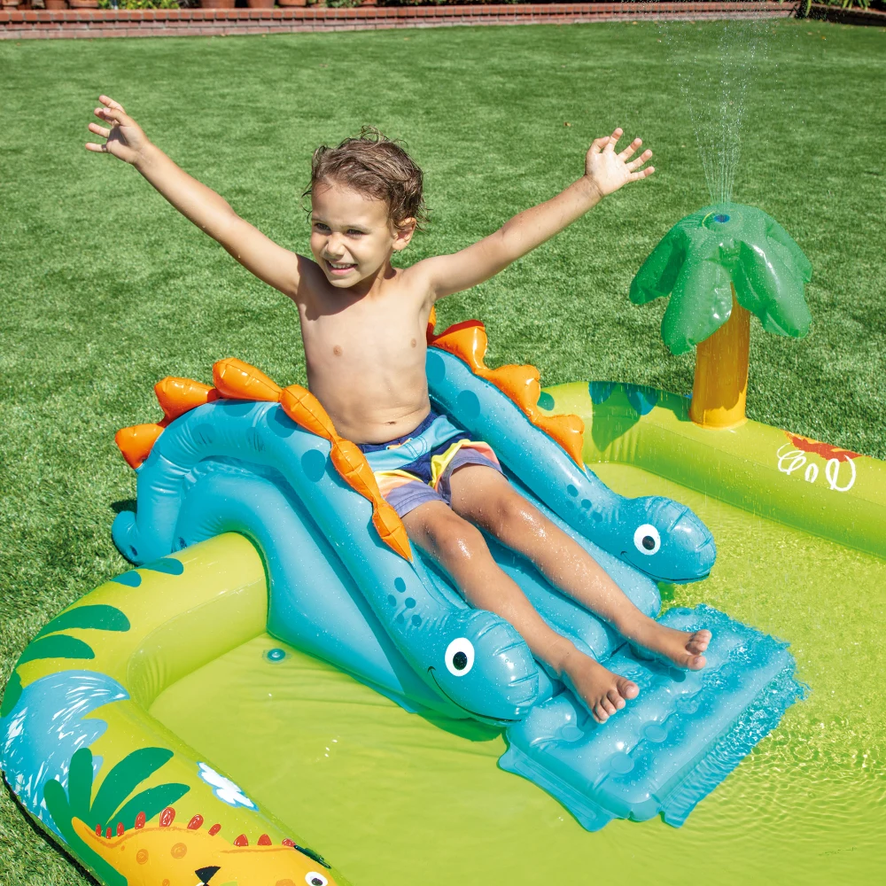 Centrul de joacă gonflabil Micul Dino este conceput pentru a oferi copiilor o experiență de joacă acvatică adaptată vârstei mici, într-un format compact și ușor de amplasat în curte sau grădină. Structura include o piscină gonflabilă cu capacitate de 143 litri, un tobogan integrat cu zonă de aterizare joasă și figurine tematice care stimulează joaca activă.