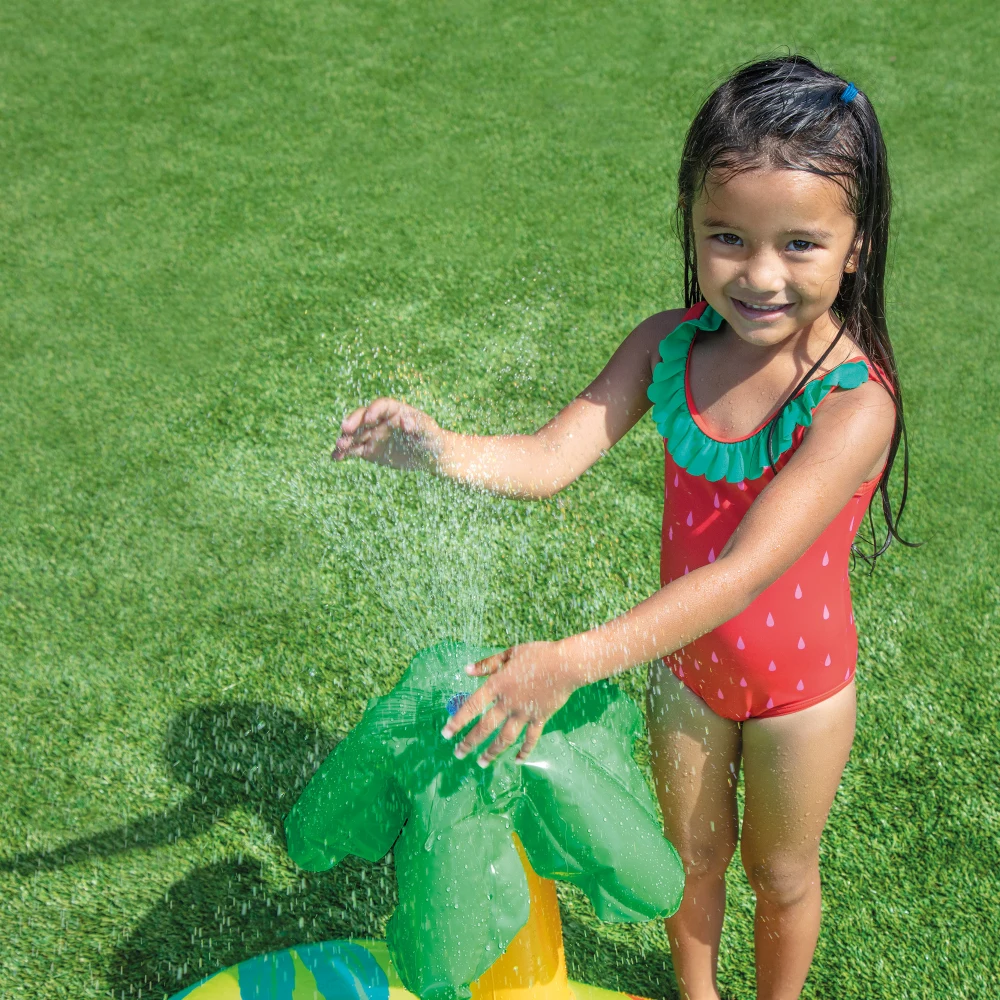 Palmierul gonflabil poate fi conectat la un furtun de grădină și funcționează ca duș, adăugând un plus de răcorire și interactivitate. Centrul este proiectat pentru stabilitate și utilizare sigură, fiind potrivit pentru o greutate totală de până la 54 kg.