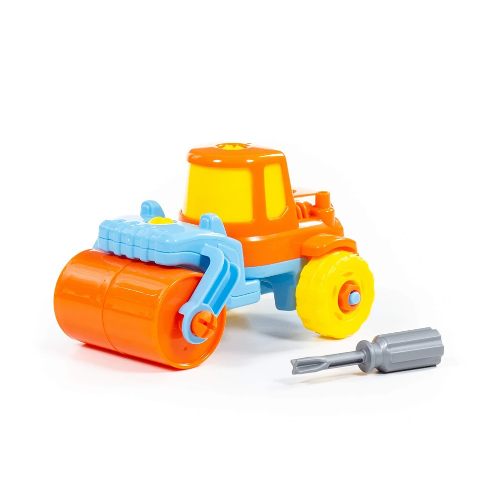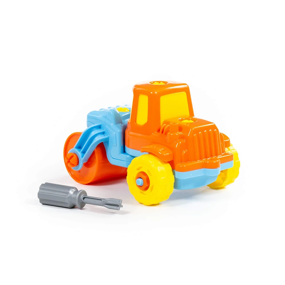 Cilindru compactor de jucărie tip constructor, cu piese ce pot fi asamblate și dezasamblate, ideal pentru joacă educativă și dezvoltarea îndemânării.
