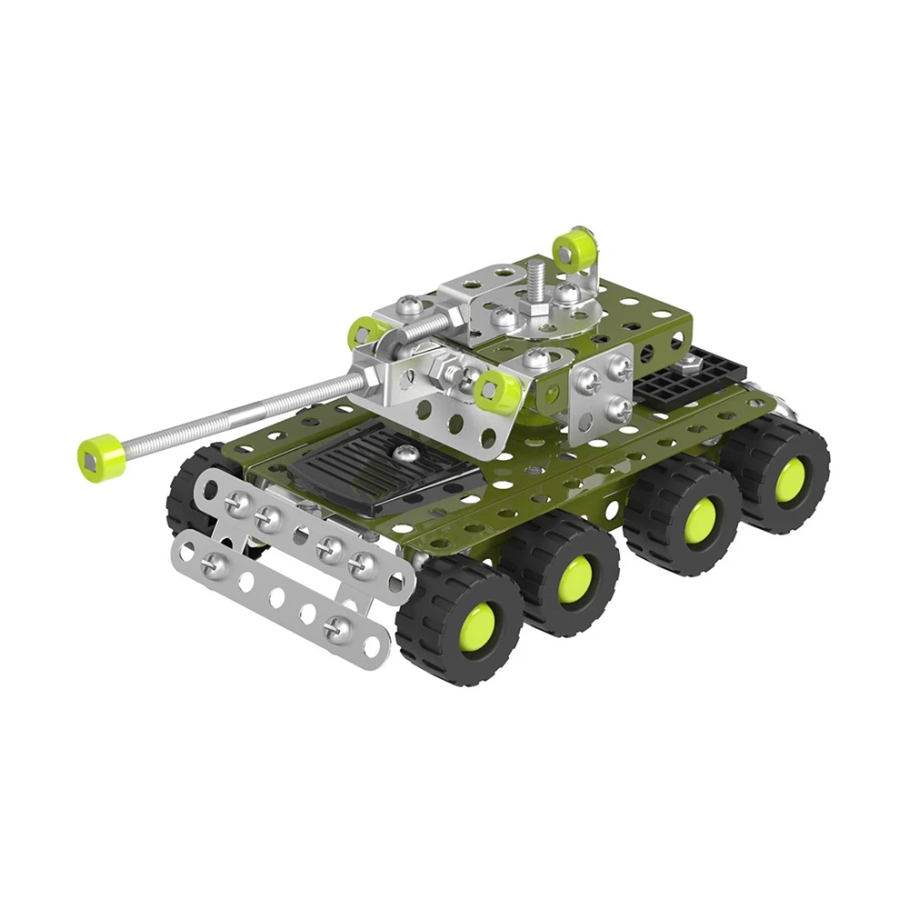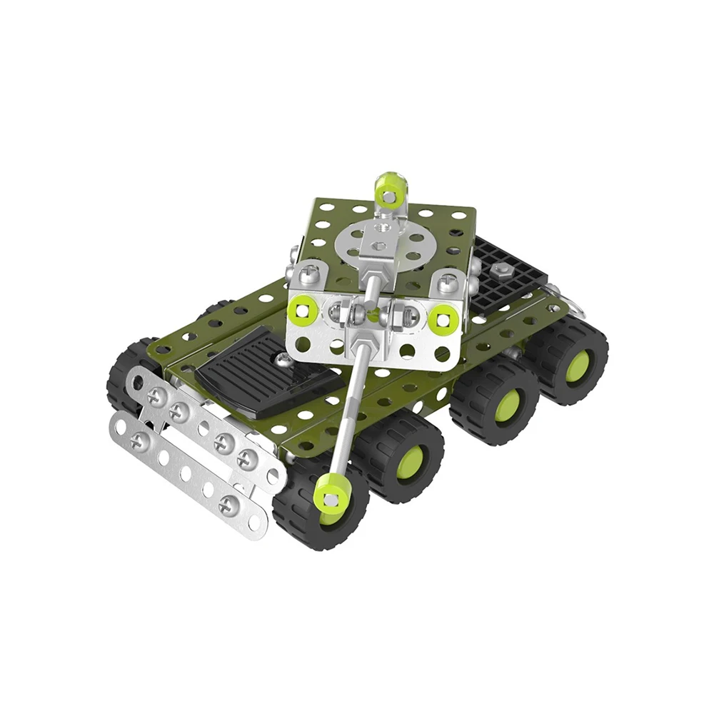 Constructor metalic pentru copii de la 5 ani, cu 174 de piese, destinat asamblării unui tanc. Joc educativ care dezvoltă logica și îndemânarea.