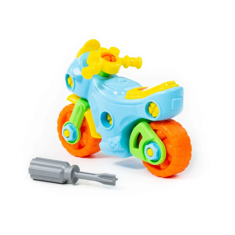Constructorul motocicletă cu 25 de piese este o jucărie educativă și distractivă, care permite copiilor să asambleze pas cu pas o motocicletă colorată, folosind unealta inclusă.