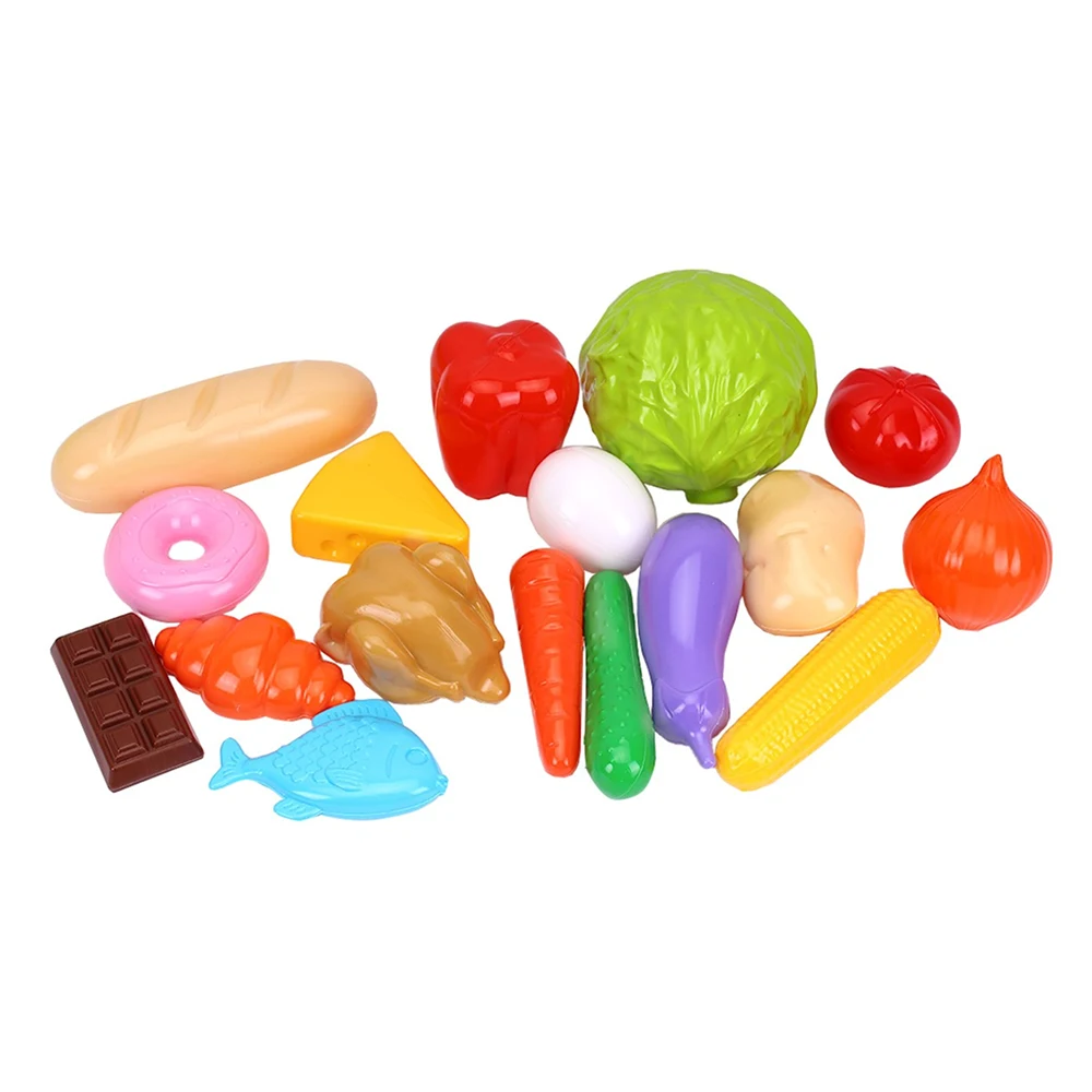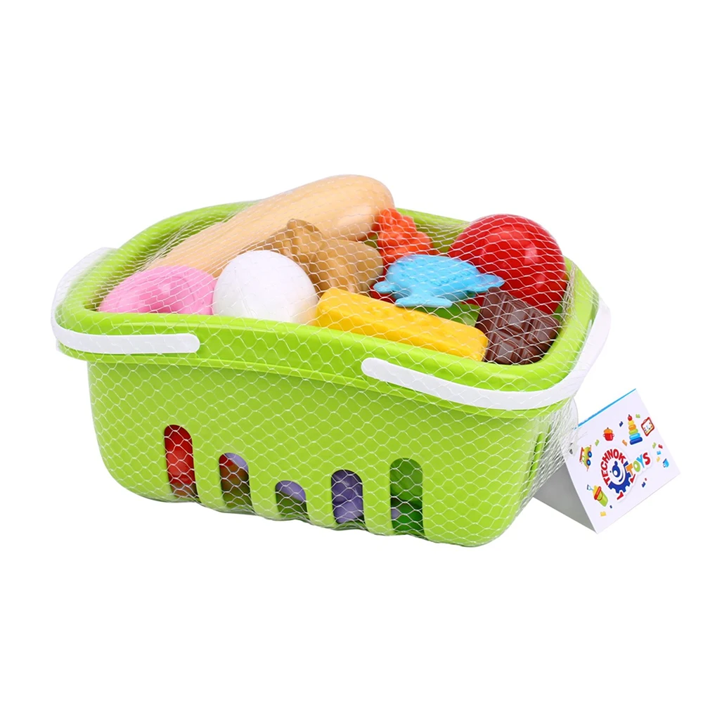 Set de joacă cu alimente din plastic, așezate într-un coș practic, ideal pentru jocuri de rol, dezvoltarea imaginației și învățarea tipurilor de alimente într-un mod distractiv.