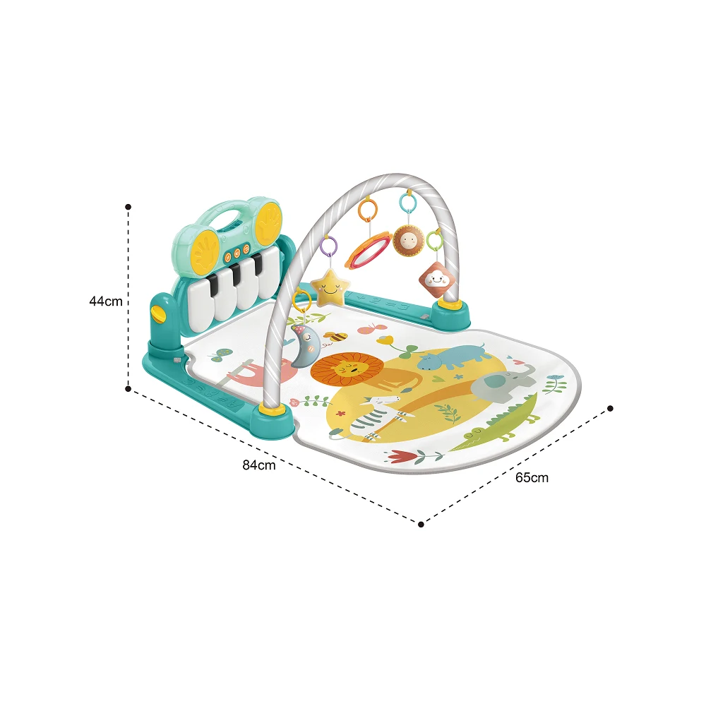 Covoraș de joacă educativ cu pian muzical și jucării interactive, conceput pentru stimularea dezvoltării senzoriale și motorii a bebelușilor încă din primele luni de viață.