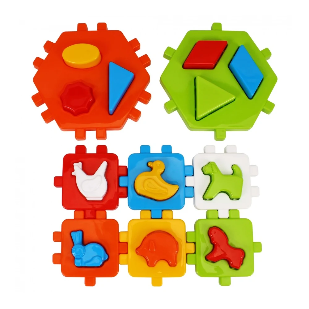 Cub educativ multifunctional, în formă de hexagon, cu forme geometrice, special creat pentru dezvoltarea timpurie a copiilor mici.
