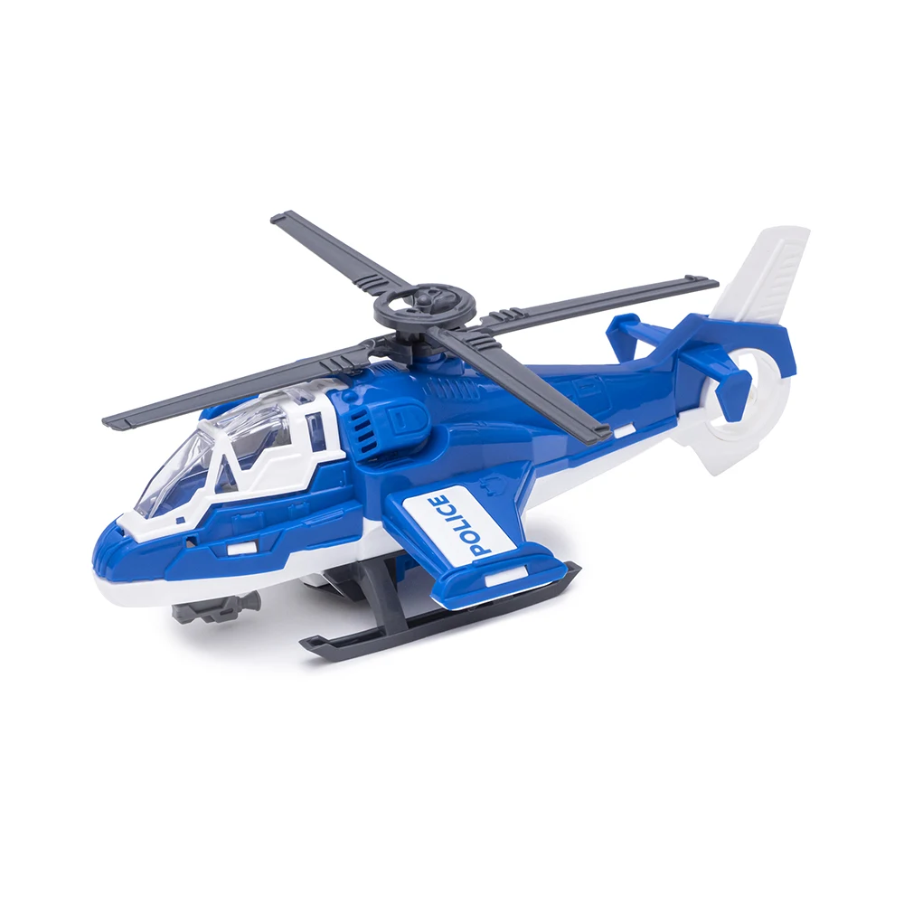 Modelul dispune de un design realist, inspirat din elicopterele utilizate în misiuni aeriene ale poliției, cu detalii bine conturate și elice mobile. Construcția este realizată din plastic rezistent, ideal pentru utilizare frecventă, iar forma ergonomică îl face ușor de manevrat de către cei mici.
