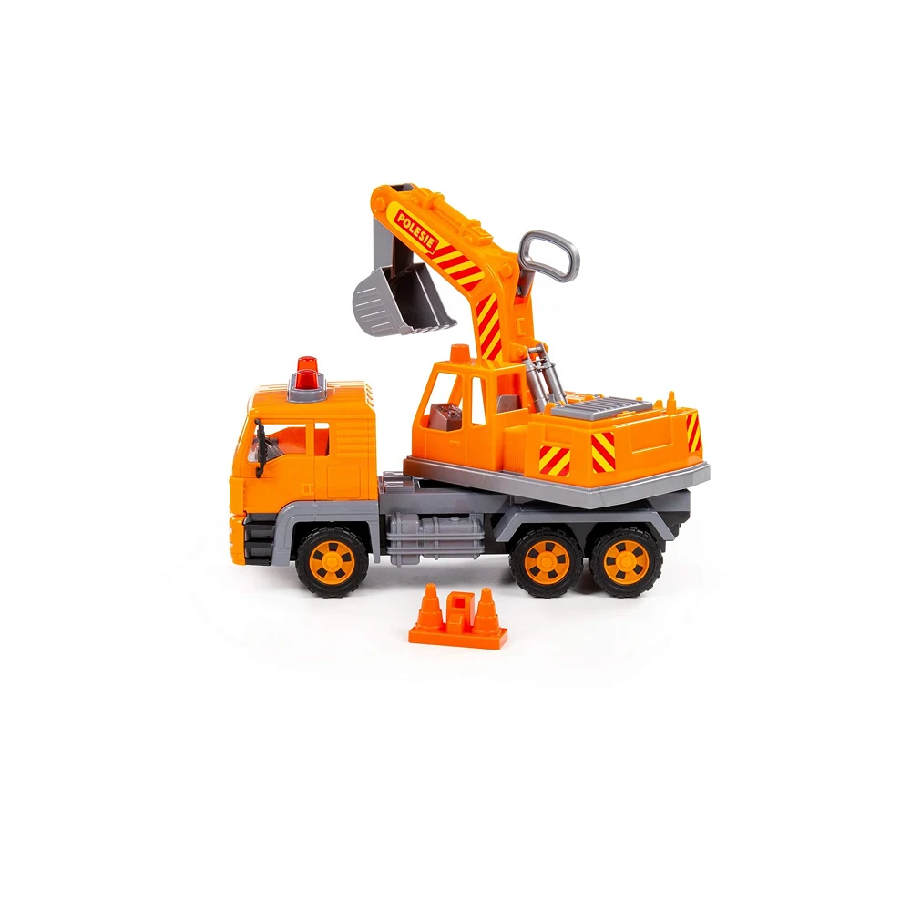 Excavatorul cu inerție este o jucărie de mari dimensiuni, ideală pentru copiii pasionați de utilaje de construcții, oferind joacă realistă și rezistență în timp.