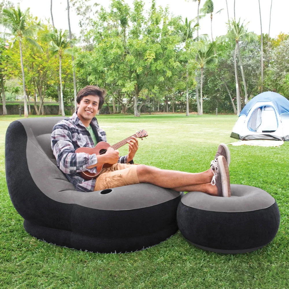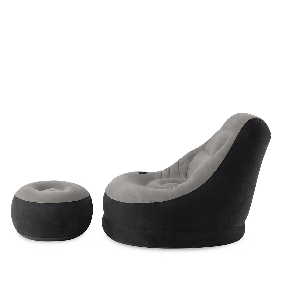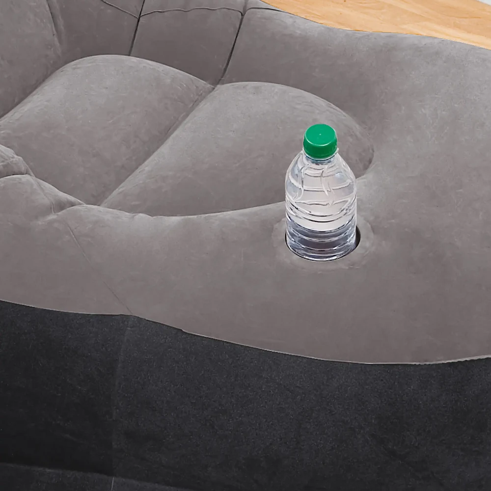 Fotoliu gonflabil confortabil, conceput pentru relaxare în interior sau exterior, cu suport separat pentru picioare (otoman) și suport pentru pahar integrat. Forma ergonomică și suprafața moale oferă o poziție comodă pentru momente de odihnă.