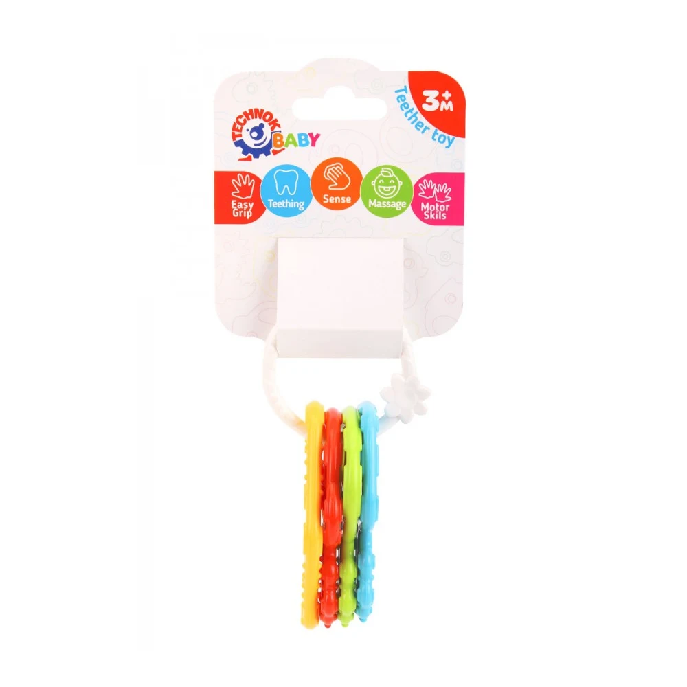 Materialele sigure și textura plăcută masează gingiile, contribuind la dezvoltarea coordonării mână–ochi și a percepției auditive. Culorile vesele stimulează curiozitatea și interesul bebelușului în timpul jocului.