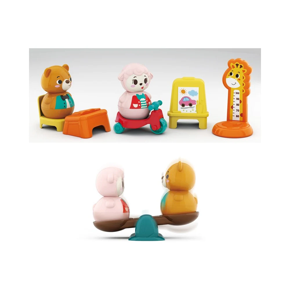 Jucăria include mai multe zone de joacă: balansoar pentru figurine, clopot care poate fi rotit, ceas cu ace mobile, elemente muzicale și piese interactive care activează sunete și melodii. Animalele pot fi introduse în diferite zone pentru a declanșa efecte sonore, transformând joaca într-o activitate captivantă și educativă.