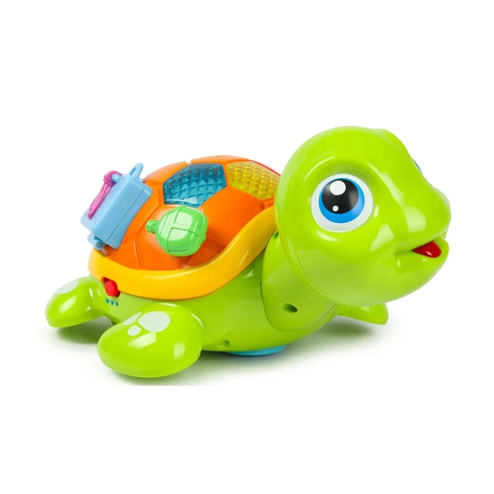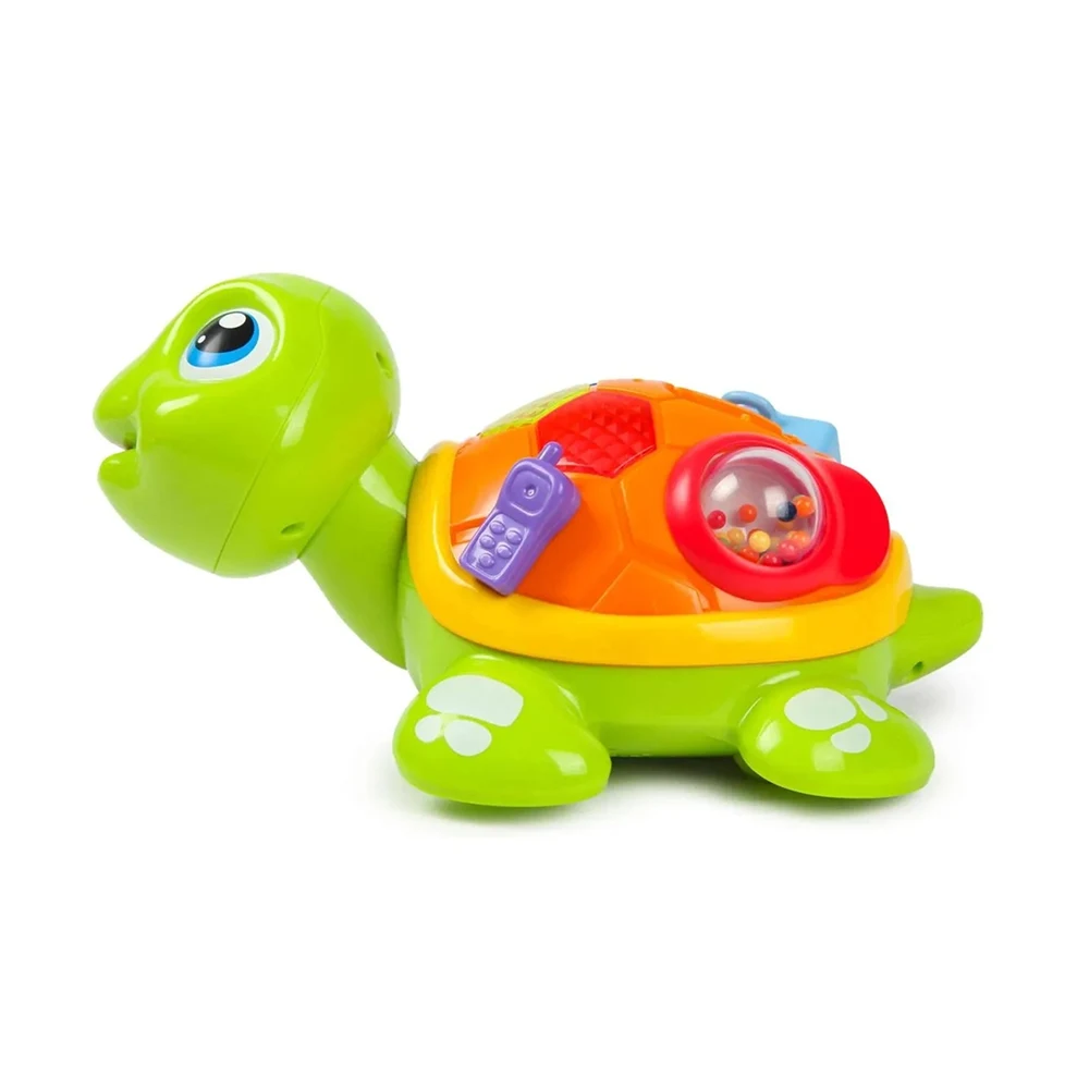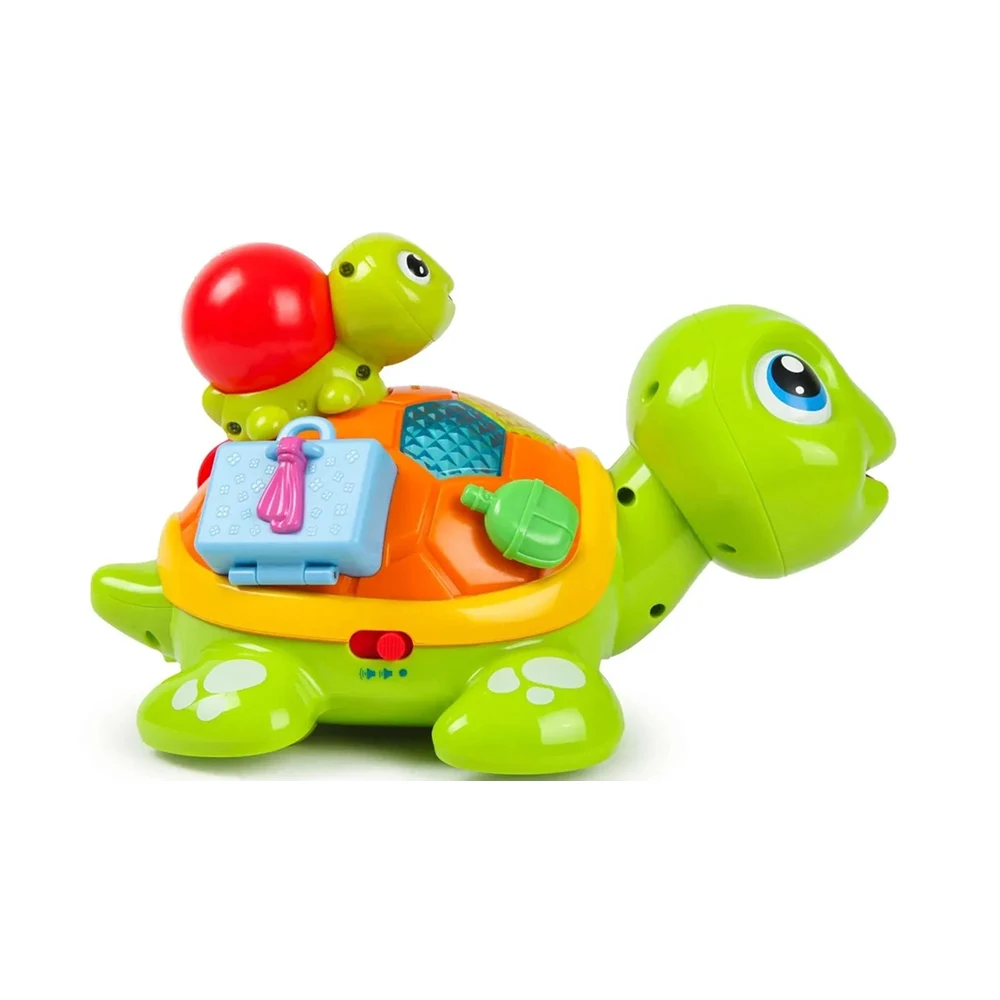 Această jucărie interactivă tip broască țestoasă este creată pentru a oferi ore întregi de distracție și învățare prin joacă. Datorită senzorilor integrați, jucăria reacționează la atingere, mișcare și interacțiune, redând sunete vesele, melodii și efecte luminoase.