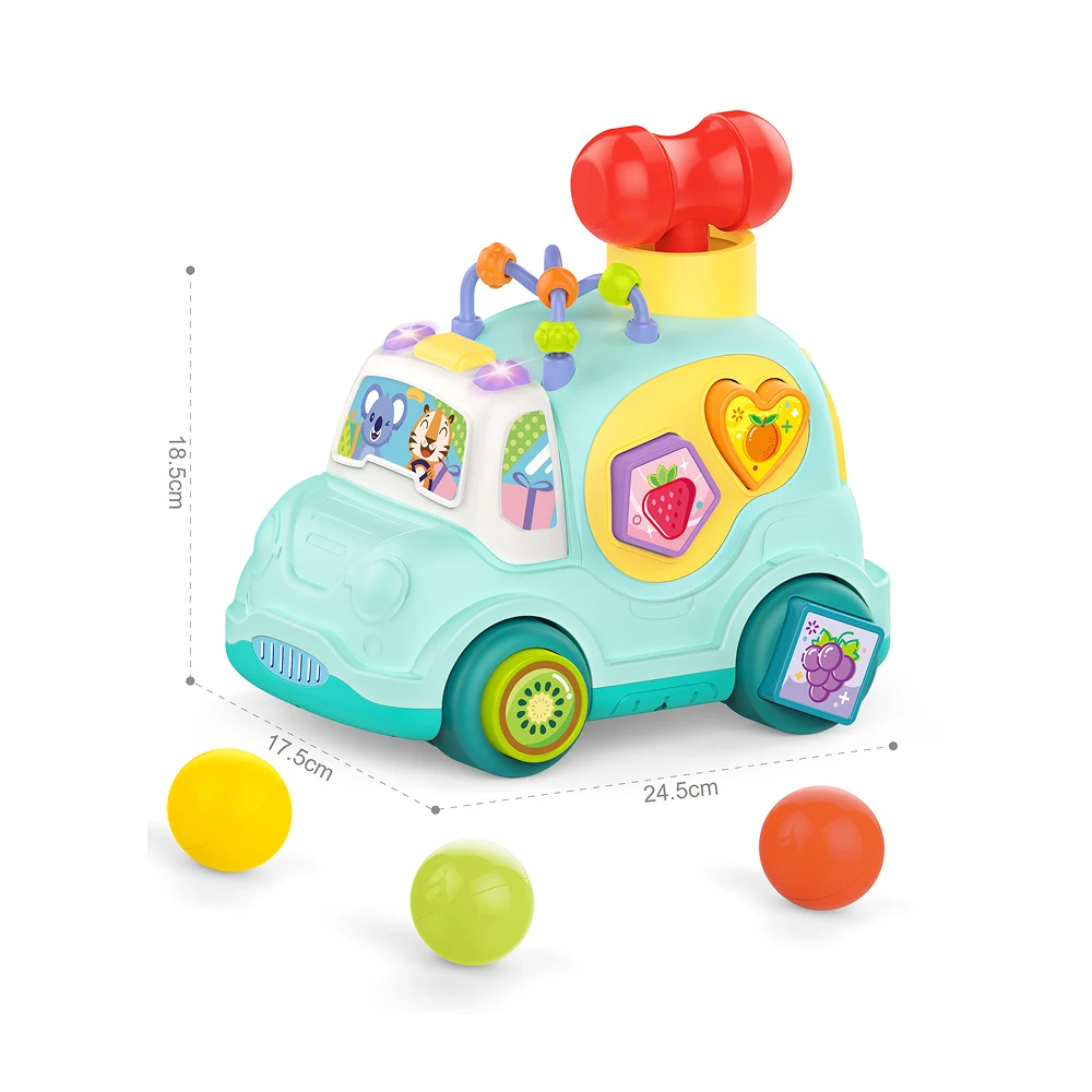 Mașinuță educativă muzicală cu sorter de forme, lumini și activități interactive, ideală pentru dezvoltarea coordonării și învățarea prin joacă a copiilor mici.