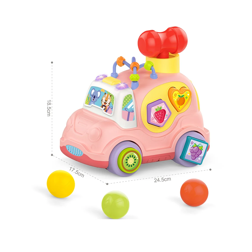 Mașinuță educativă muzicală cu sorter de forme, lumini și activități interactive, ideală pentru dezvoltarea coordonării și învățarea prin joacă a copiilor mici.
