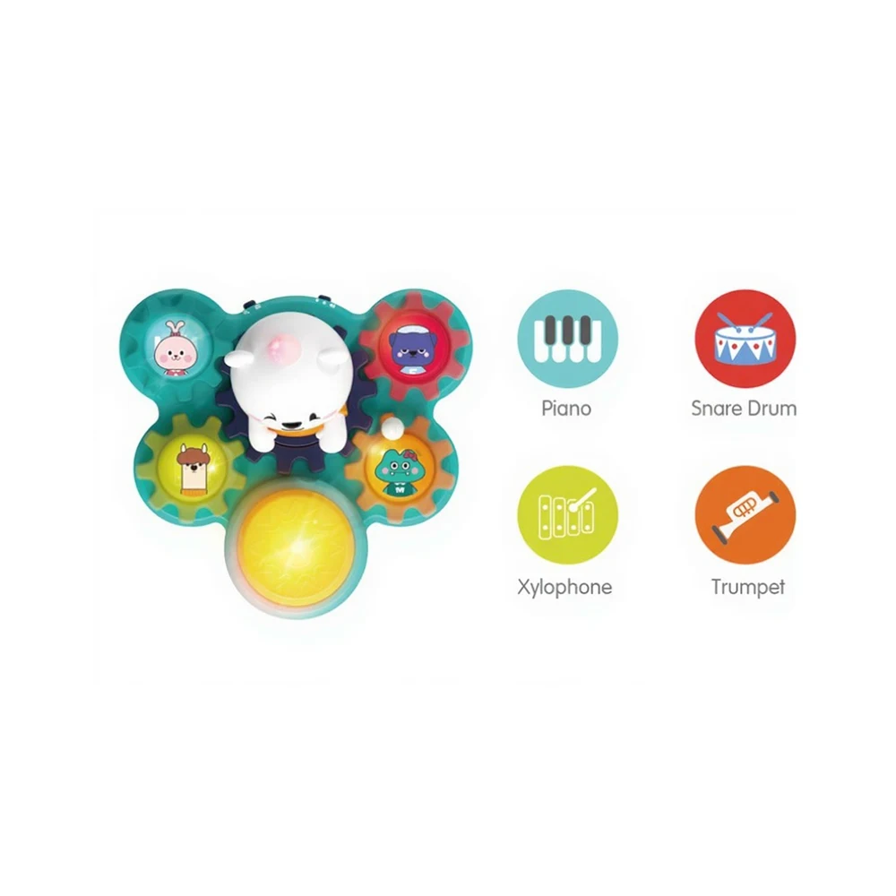 Toba muzicală interactivă cu ursuleț de la Hola este o jucărie educativă modernă, special creată pentru copiii mici, care îmbină sunetele, lumina și jocul mecanic într-o experiență captivantă. Copiii pot crea propriile melodii prin rotirea rotițelor tip angrenaj sau prin apăsarea butonului de tobă.