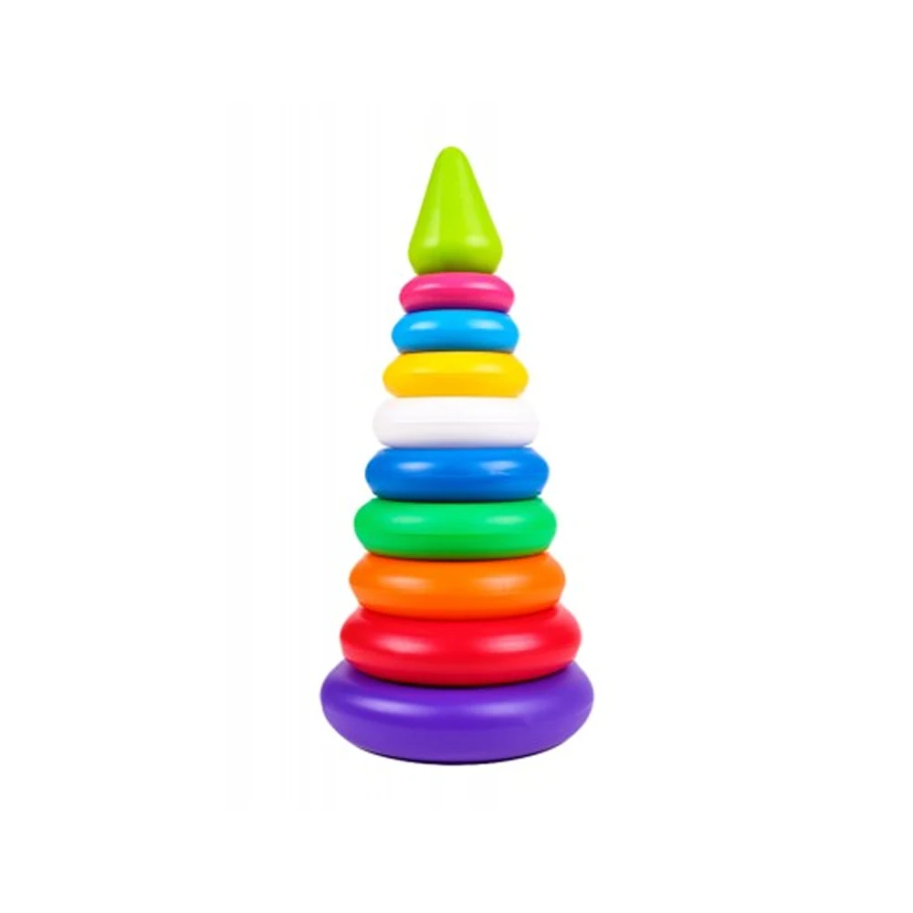 Piramidă educativă cu inele colorate, ideală pentru dezvoltarea timpurie a copilului prin joacă și sortare.