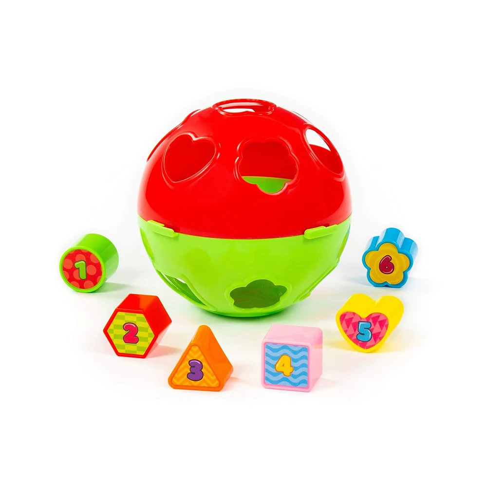 Jucărie educativă tip sferă cu sorter și forme colorate, ideală pentru dezvoltarea coordonării și a gândirii logice la copii.