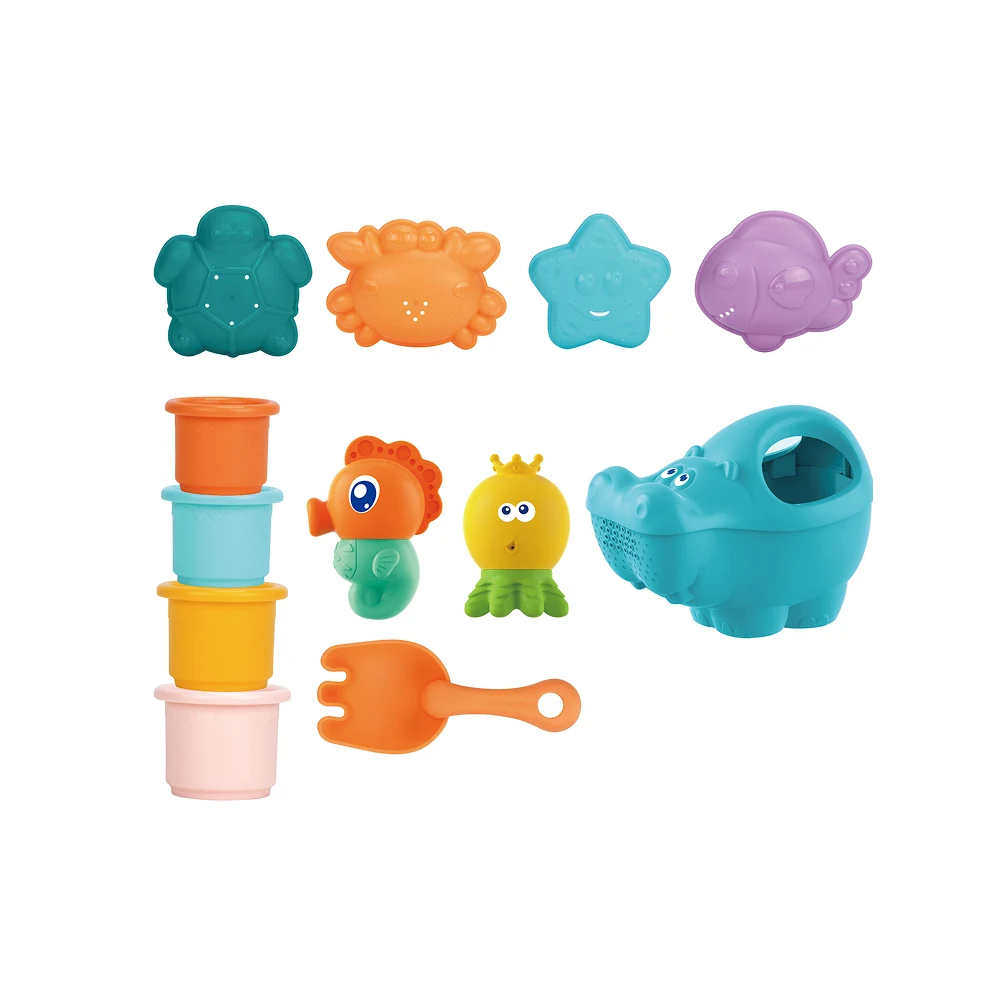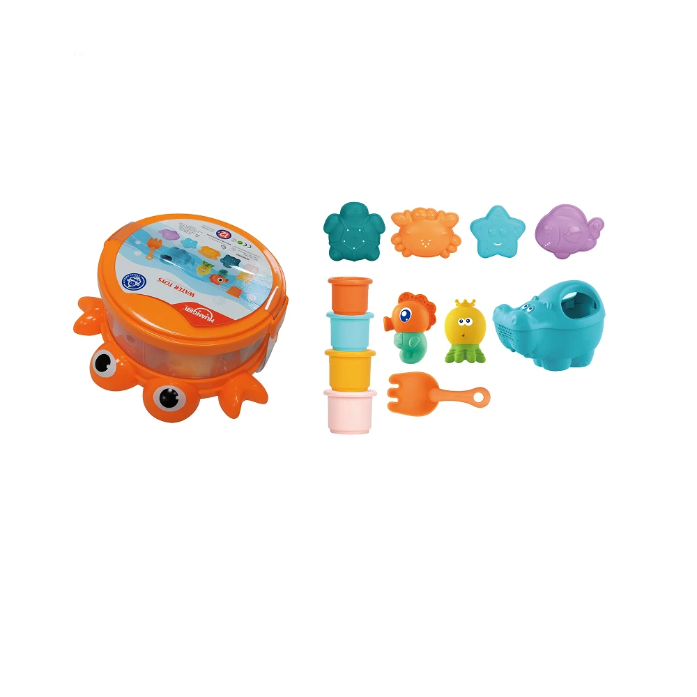 Setul include o cutie de depozitare tip crab, practică și ușor de utilizat, care permite strângerea și organizarea jucăriilor după joacă. Jucăriile pot fi folosite pentru turnarea apei, modelarea nisipului sau jocuri creative, contribuind la dezvoltarea coordonării mână-ochi și a motricității fine.