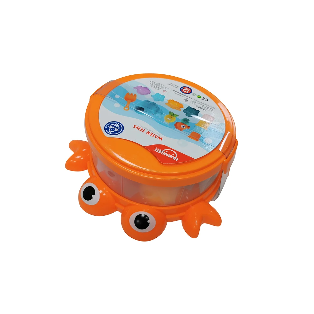 Set de jucării pentru baie și nisip, cu forme colorate și cutie practică de depozitare tip crab, ideal pentru joaca cu apă și nisip a copiilor mici.