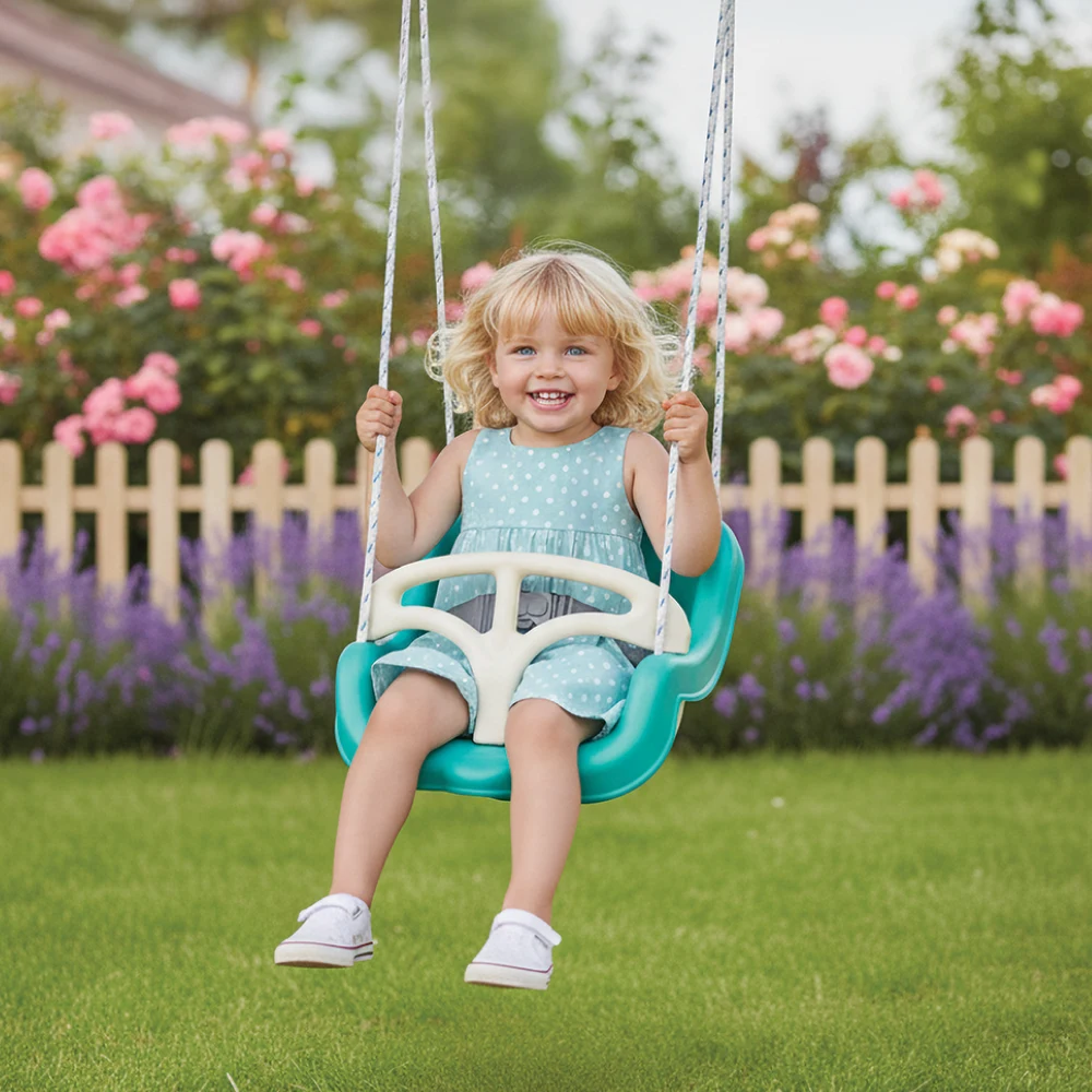 Leagăn pentru copii 3 în 1, utilizabil interior și exterior, cu spătar și protecție frontală, adaptat diferitelor etape de creștere.