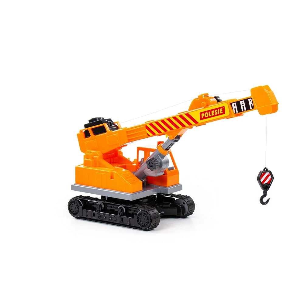 Macara pe șenile cu braț mobil și cârlig de ridicare, ideală pentru jocuri de construcții și activități de tip șantier.