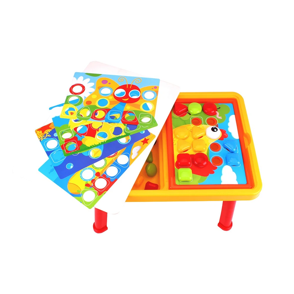 Masa de joacă cu mozaic este o jucărie educativă pentru copii de la 2 ani, ideală pentru dezvoltarea creativității, a coordonării și a recunoașterii culorilor, prin activități interactive și distractive.
