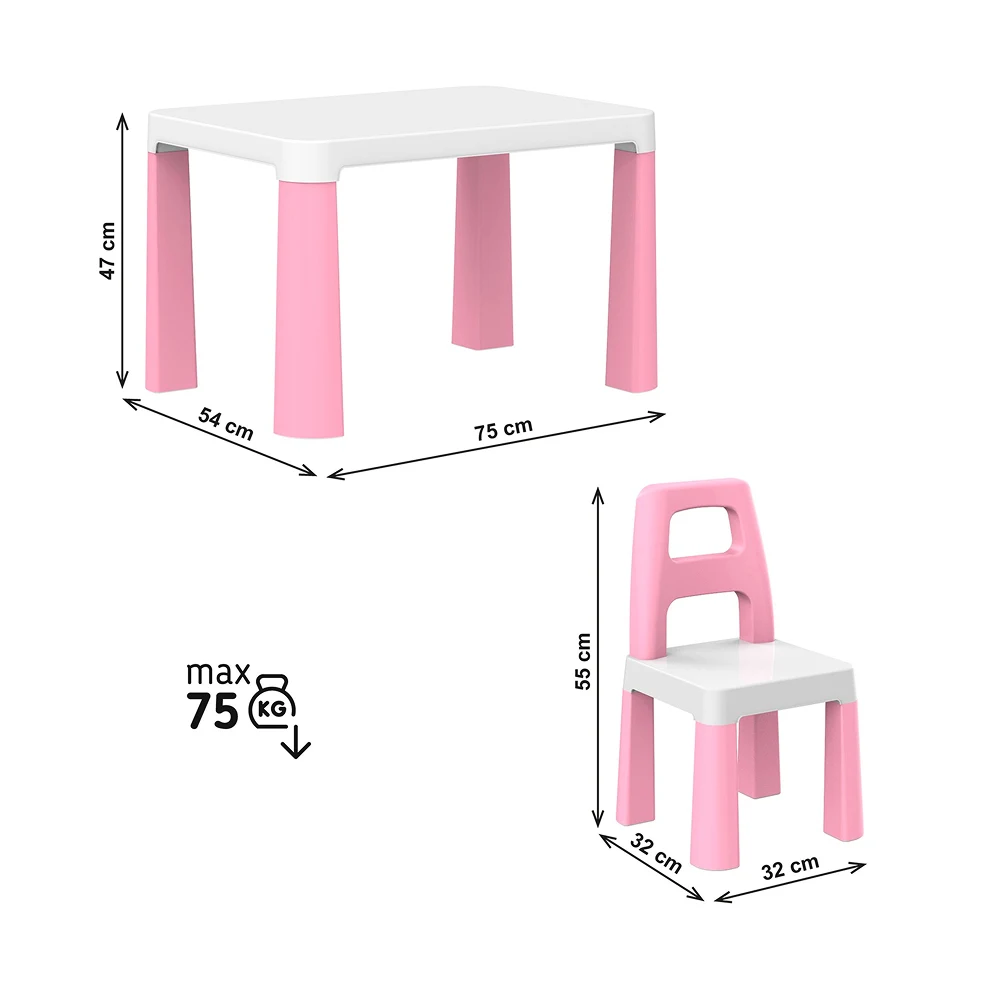 Realizat din plastic rezistent, cu colțuri rotunjite, setul oferă stabilitate și siguranță. Designul simplu și culorile plăcute se integrează ușor în orice cameră pentru copii, fiind potrivit atât pentru interior, cât și pentru spații de joacă amenajate.