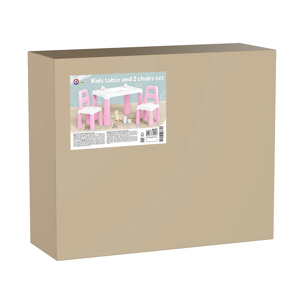 Masă pentru copii cu două scaune, ideală pentru joacă, desen, citit sau luat masa. Designul stabil și dimensiunile adaptate celor mici oferă confort și siguranță în utilizare.